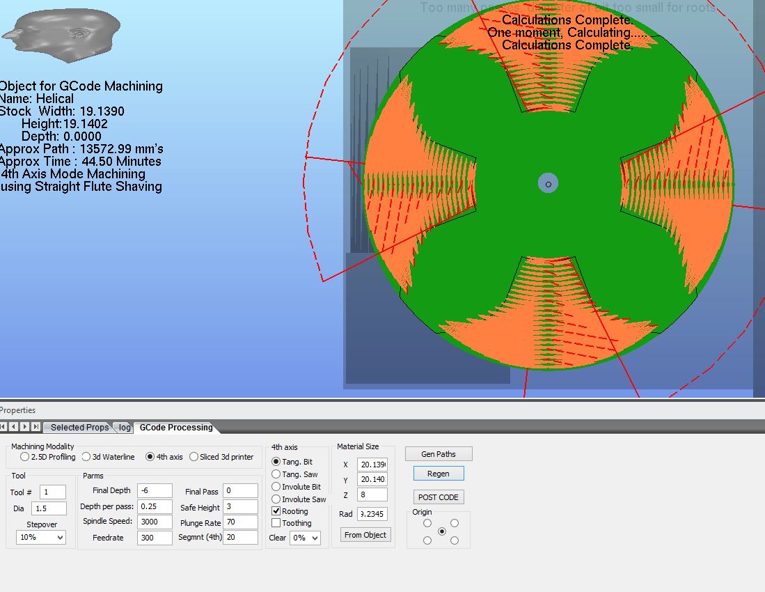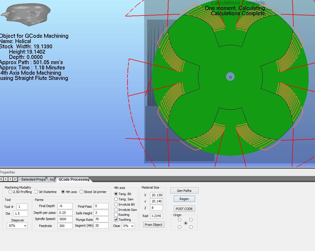 Been saying that for over 10 years. :) . Hey, I live this stuff, I dream in 3d at this point and normals, vectors, tangents and such roll around between my ears. I see things you cannot simply because Im involved in their math every day. On the other hand this blinds me to things I dont do every day ..like cutting gears. It makes it hard for me to see what your saying in exactly the same way its hard for you to see what Im saying. In the end its only about getting enough evidence to point to the trouble. It all helps though, I now know how many more config items I have to add when I redo the 4th axis to its own tab. I agree with you, more step size choices need to be available, Ill make that happen..