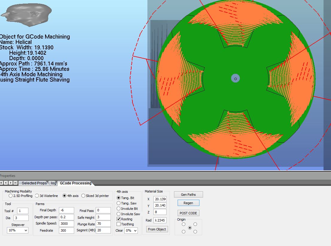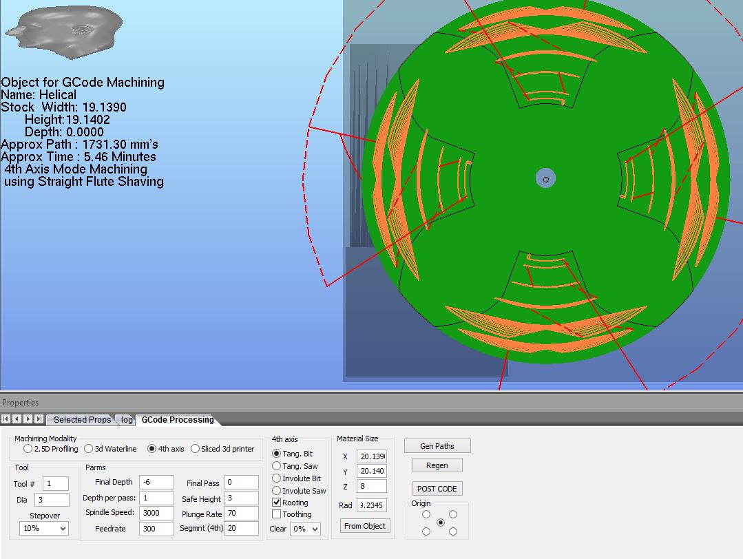 The tool shape stored with each gear type is stolen from the gear outline before its teeth are copied around the gear. I design one tooth and copy it in all gears except non-circulars where each tooth is different. In the case of your helical for example, the non-involute result of the calculations is stored, then re-zeroed and kept in memory as "ToothShape" - a series of points referenced to 0,0 being top center of the tooth. When the toolpather goes to make a helical toolpath( or any toolpath), it looks to that stored tooth, does collision calculations and curve fitting operations to find any point intersection with that curve. SO when its rooting for example, I start at the top and ask the intersection calculator "How far to the left before I hit the profile at this depth?" I subtract the clearance and tool radius from that and thats how far over I go. Each depth is different width of course. This allows a sprocket, pulley..anything to be machined with the same strategy.