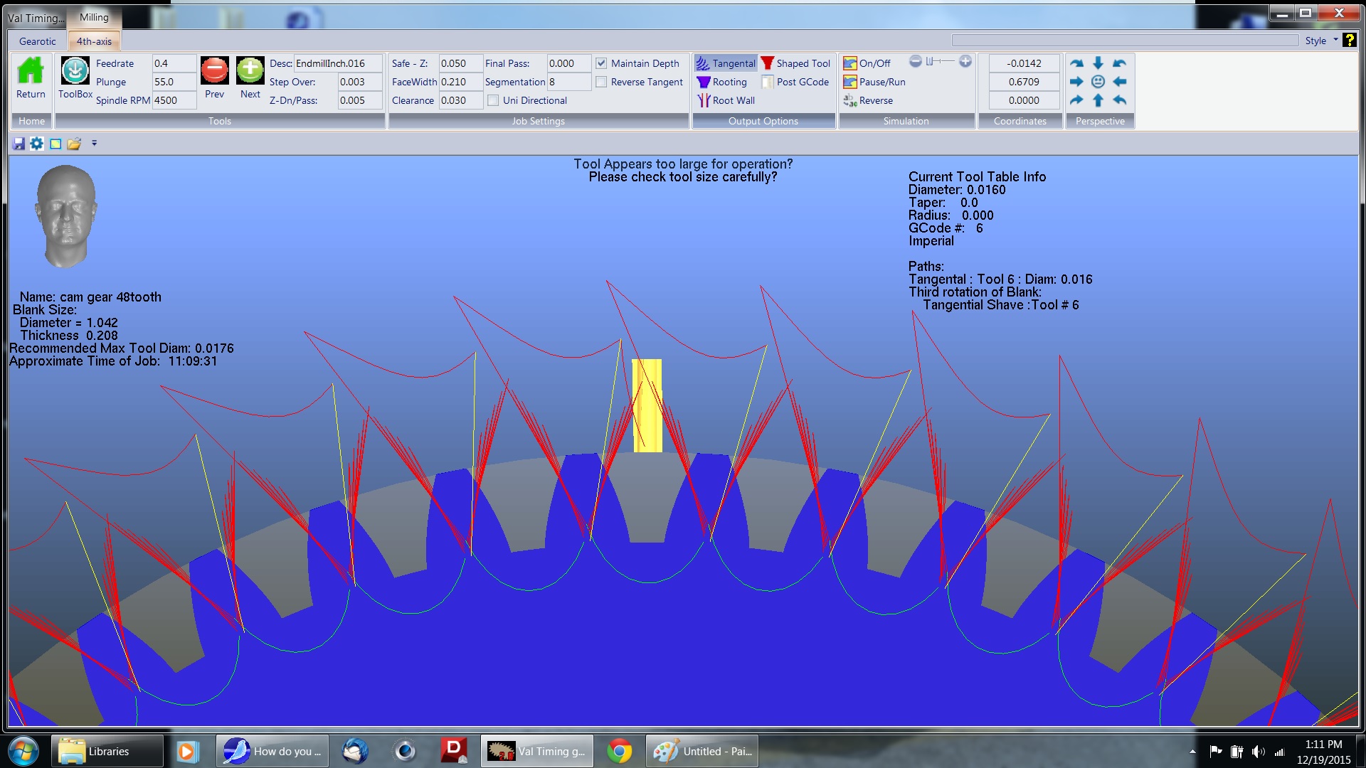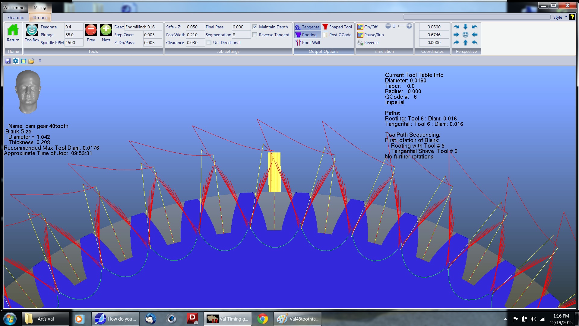 I've taken some screen shots in hopes of clearing up ?'s. Yes there does appear to be two issues as you have stated. I went into the tool box and changed the stepover to .003" left the depth of cut at .005, I am using a carbide .016" two flute end mill I don't recall of the top of my head what the depth of cut was but set that as .048". Previously I had gotten the root wall pass and the tangental pass with the origin in the middle of the tooth not the gap between. The first shot is the home screen before clicking on the move to fourth axis button. I then did the screen shot after sending it to 4th axis and before the message disappeared. I then added the rooting (which didn't tell me it was to many passes) and the third shot is that one. I hope that this gives more information than I could impart by typing :-\.