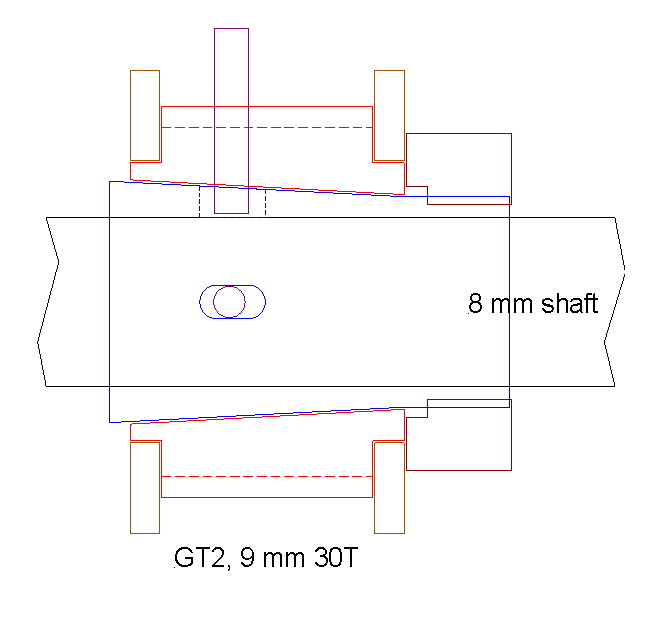 The vertical rod in the middle needs some explaining. When you try to tighten the nut, there is a bit more friction between the nut and the taperlock fitting than between the taperlock and the pulley. So the taperlock spins and the nut never tightens. This is normally solved with a bit of key steel, but try doing that at these dimensions! (I did try, but the results were not good enough.)