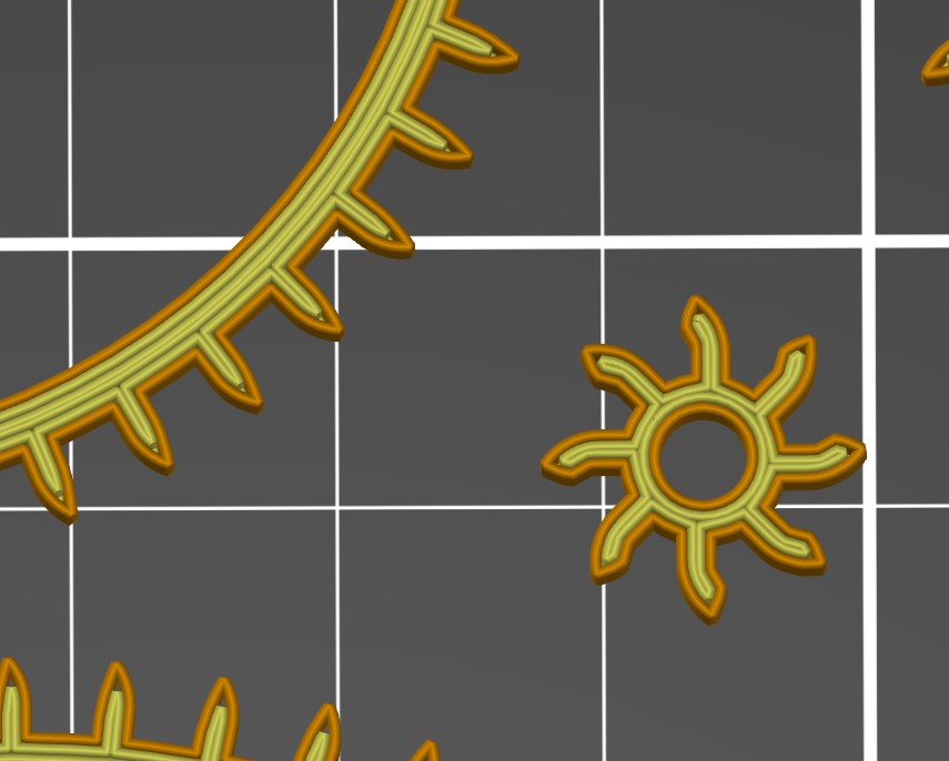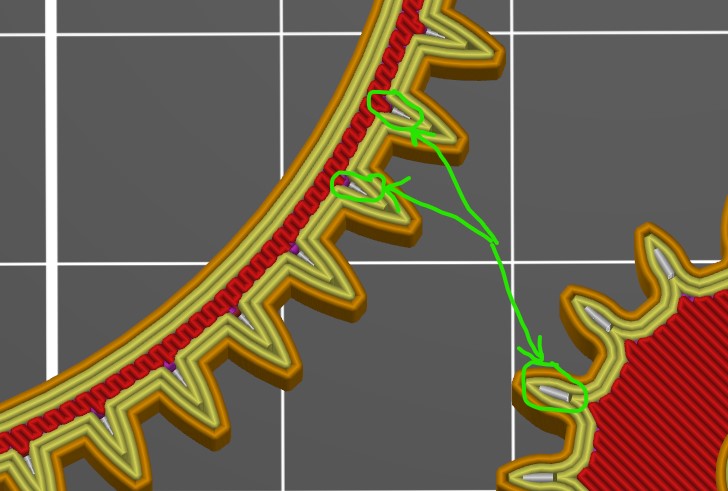 The pictures below show the sliced output of fancy gears and normal gears. Notice all the tiny infill segments on the normal gears (marked in green). Each one has a retraction and the possibility of creating a string or a small blob. These small imperfections add slightly to the surface roughness. The fancy gears print about 25% faster and are amazingly smooth.