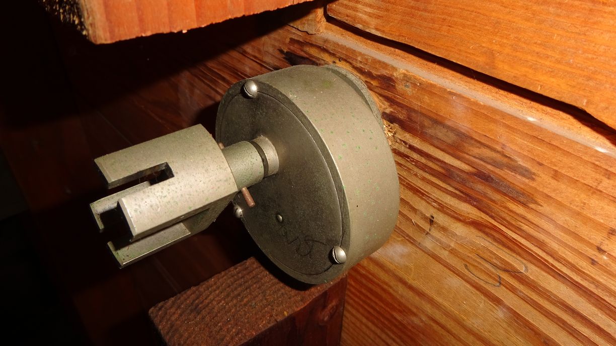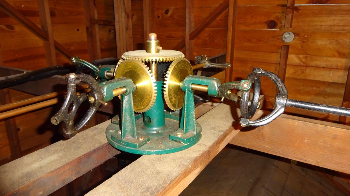 The attached photos show the inside of the clock tower. The 4-way bevel gear split is kind of unusual..the top gear is 60T and the mating gears are 50T. This reverses the 50T-60T gearing in the clock room. Our guess is that the first 50T-60T reduction may have been used to bump up the torque a bit prior to the chain of bevel gears to the tower. When the clock was last running in early 2010 the wear and buildup of friction had reduced operations to a single dial. Input /Output of each bevel set is driven via universal joints.