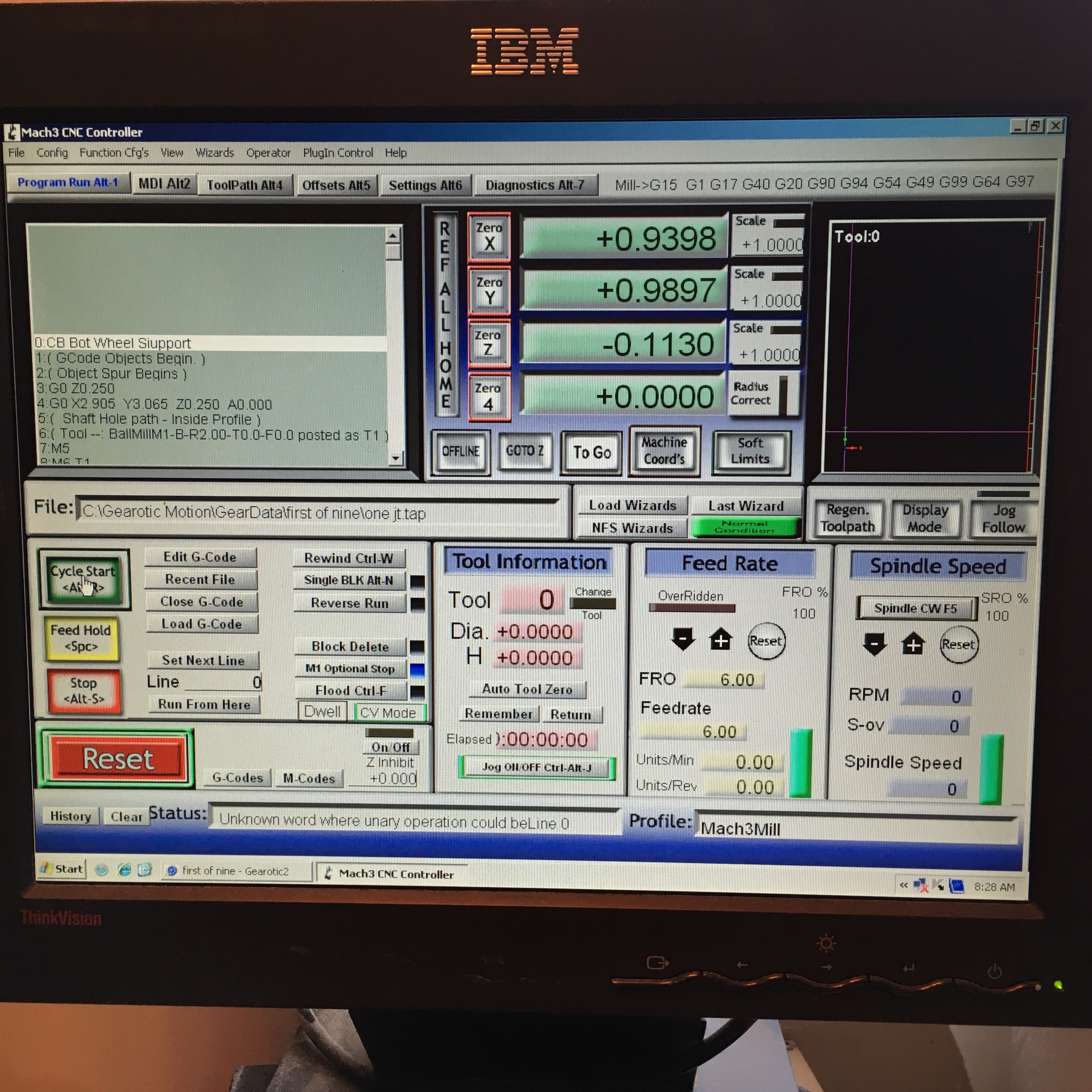 I have created a simple circular gear, about 4.5 inches in diameter with the latest download of Gearotic (3rd axis generated). I load it into Mach 3 version 2.0 and the G code loads, I can see it on the Mach3 screen but it won't run the machine. If I load older files will run fine but not the new one.