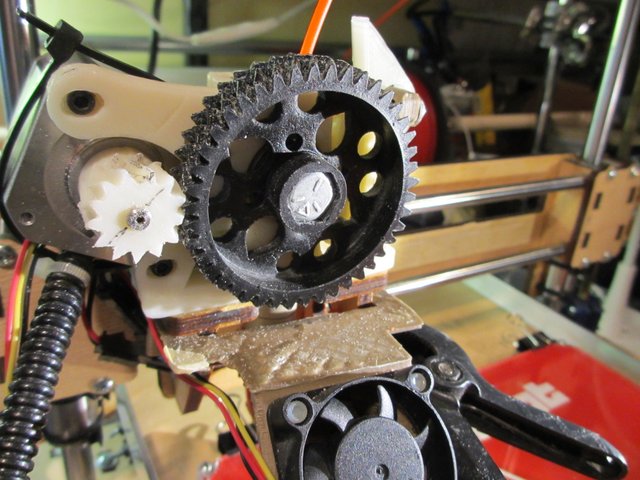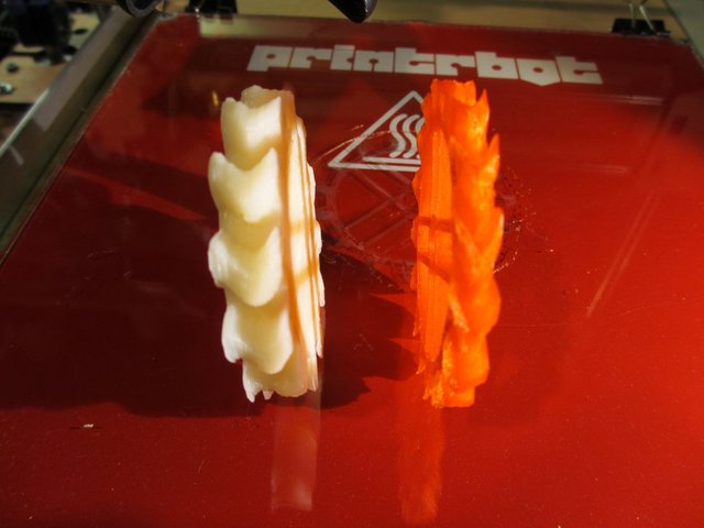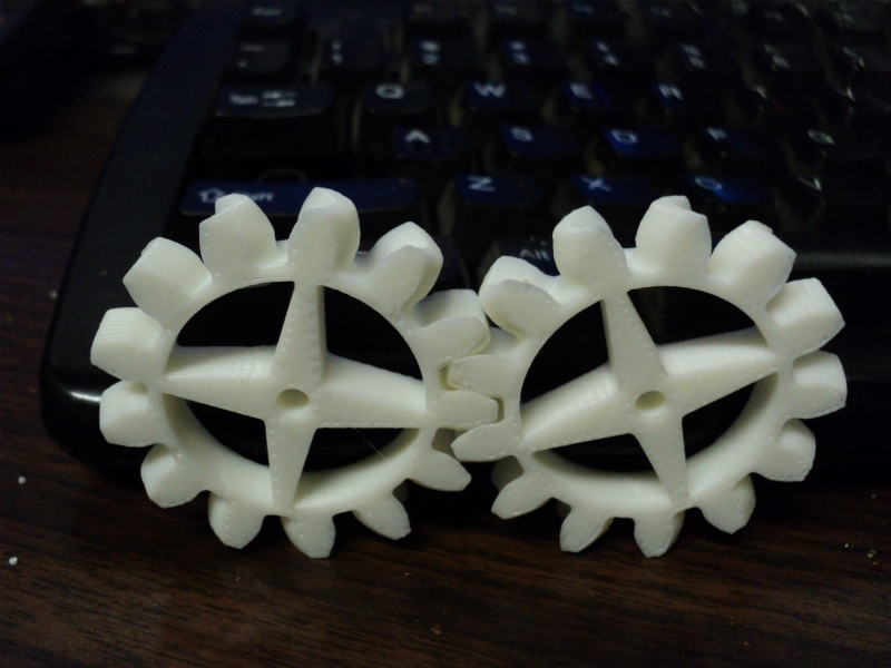 Don't laugh too loud; here's the pix.  The white gear is the one from last year, the red one's tonights, the lighting's not very good so I hope they turn out.  It's printed with 0.10mm layers, 0.3mm homemade nozzle, and in PLA.