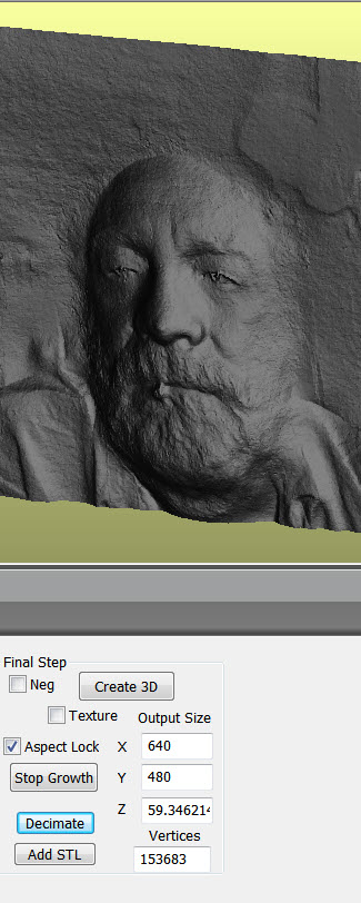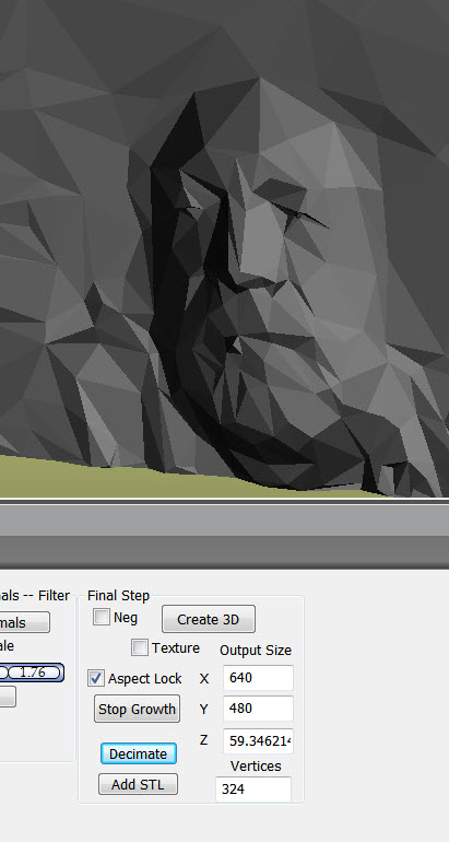 heres a few photos showing what happens to my head as I decimate from 300,000 vertices to 324 vertices in binary steps of 50% reduction.. You press a button to divide the