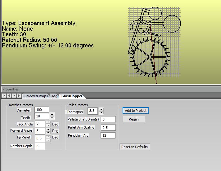 However: Simply closing down GM and reopening it, then selecting 'Grasshopper' will open an escapement with the same settings I had set before closing it. This will simulate correctly in both 'tools' and 'project'.