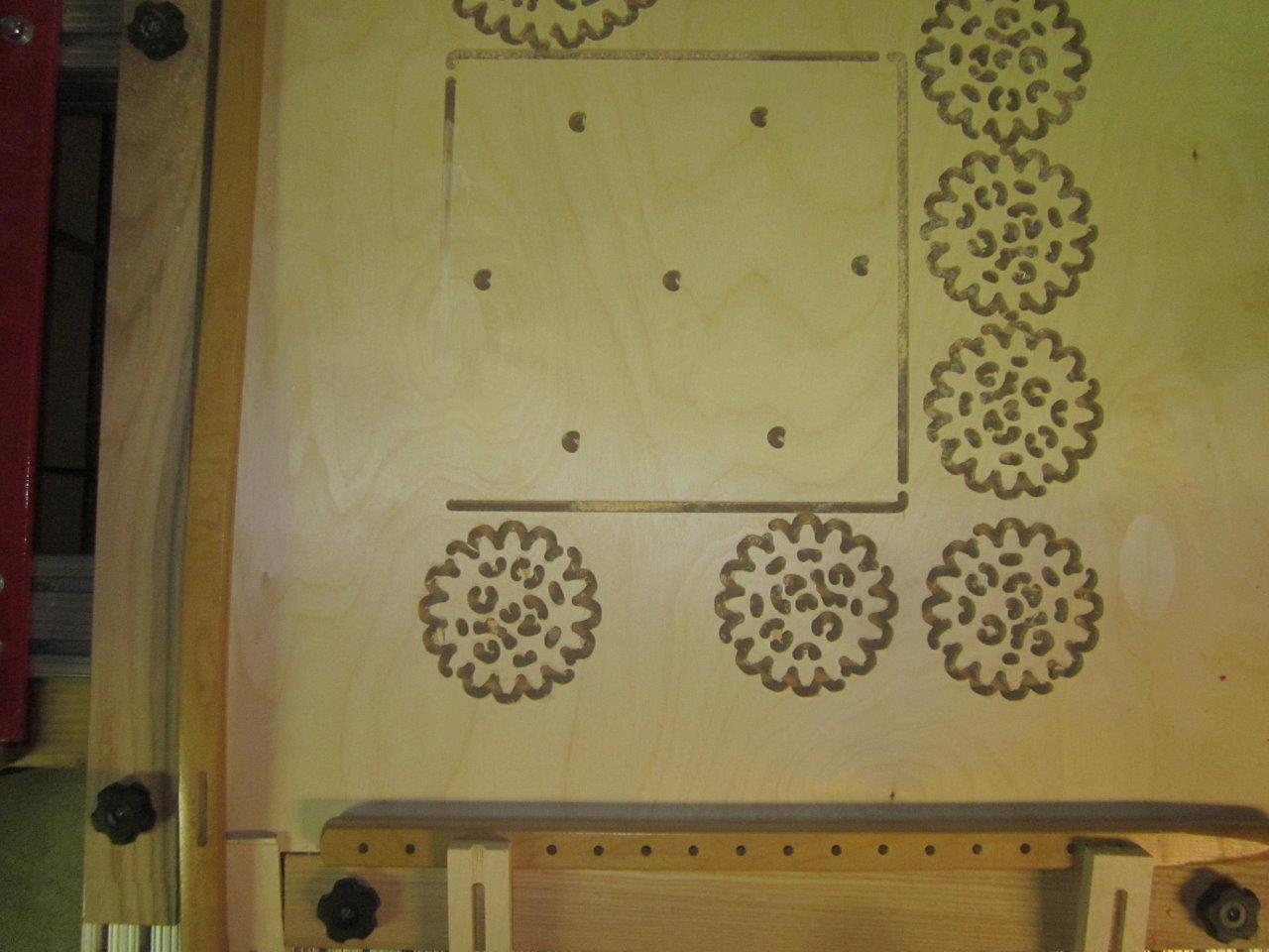 With that, I've now been able to layout my first project. I started with a few pinions around a wheel, all boxed. I sent the gears and the box to the workspace, deleted the front of the box (retaining just the rear). Highlighted them all, had it create and post the g-code. I used a 1/4" cutter so I can understand the lack of detail in the gears, but what I cannot explain is:
