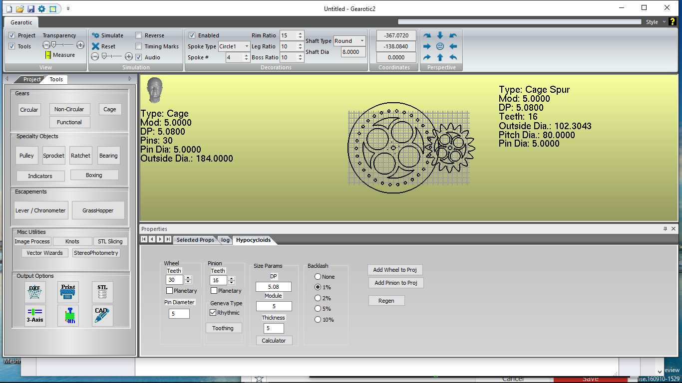 >>Cage gear simulatio n with 4 circle1 spokes is somewhat weird. The spokes in the wheel jump around quite a bit, and if the wheel and pinion both have an even number of spokes the teeth don't mesh.