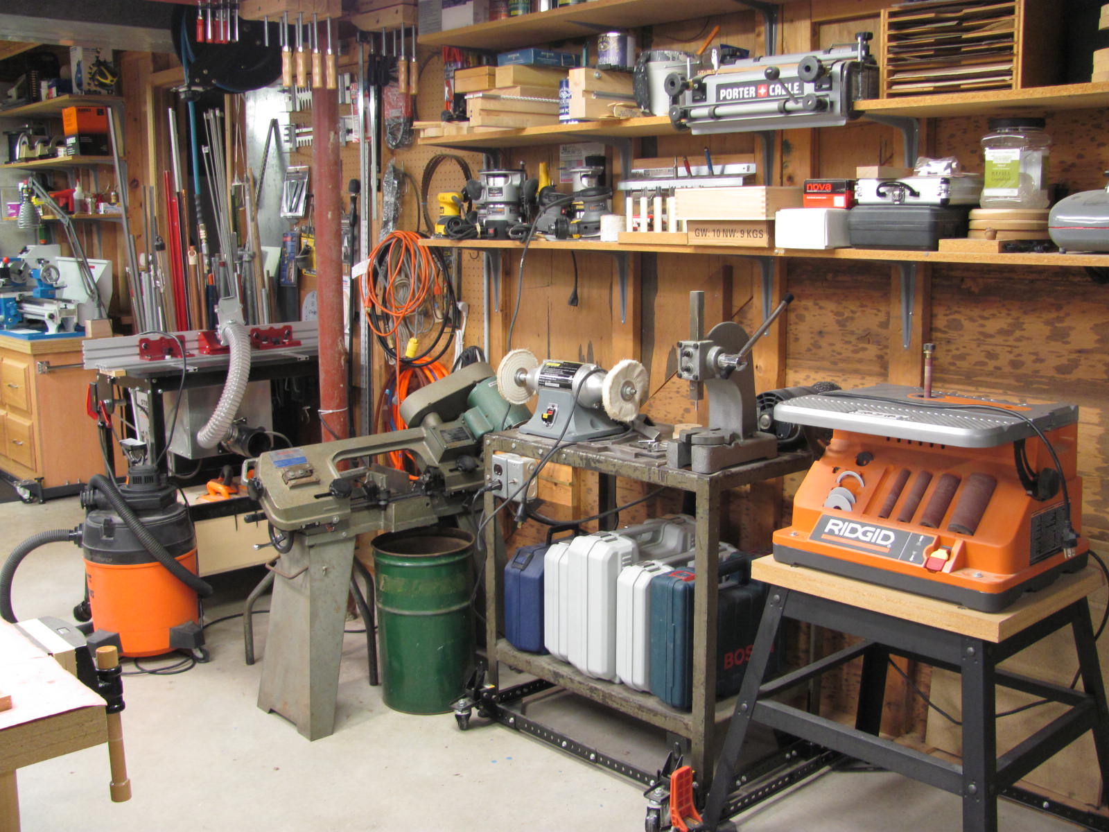 You opened a can of worms asking about my shop. Others have commented on it from time to time so I will give you a little pictorial tour. FYI, my shop is not overly neat, it varies depending on the state of my work in process. I will probably have to post over three messages due to the number of photos. Since I have limited space (don't we all), most stationary tools are mounted on wheels and I move them into a clear space as needed. One thing for certain, I have a very understanding wife!