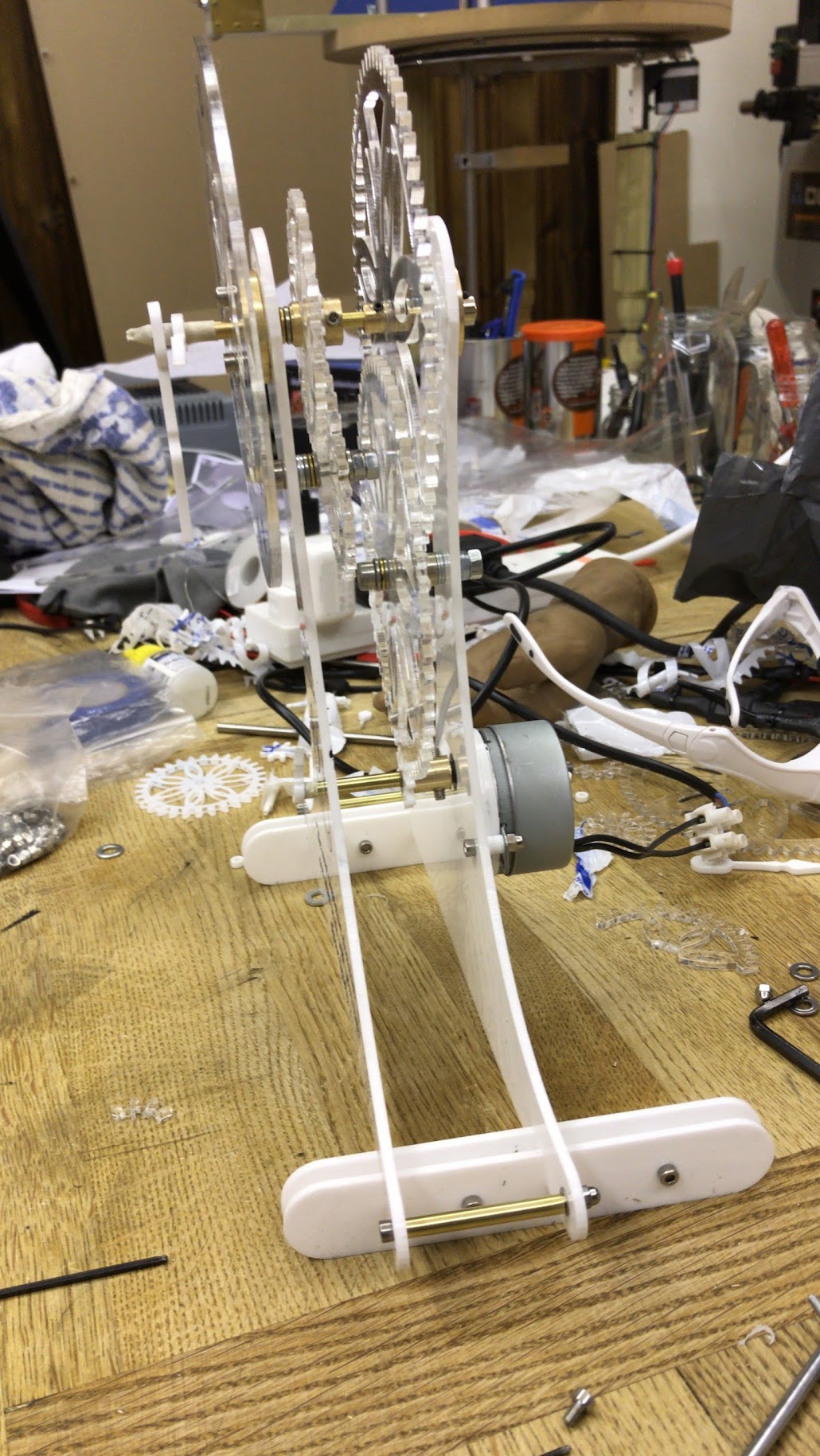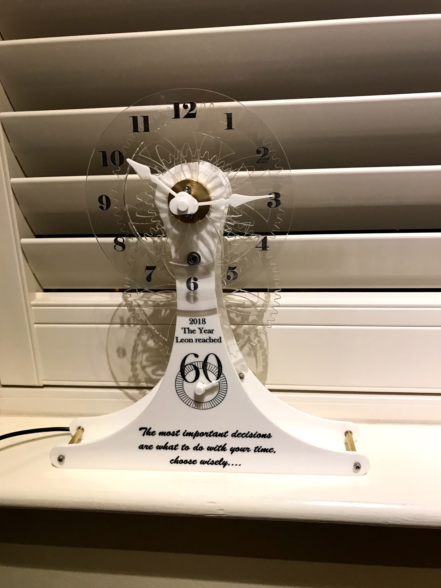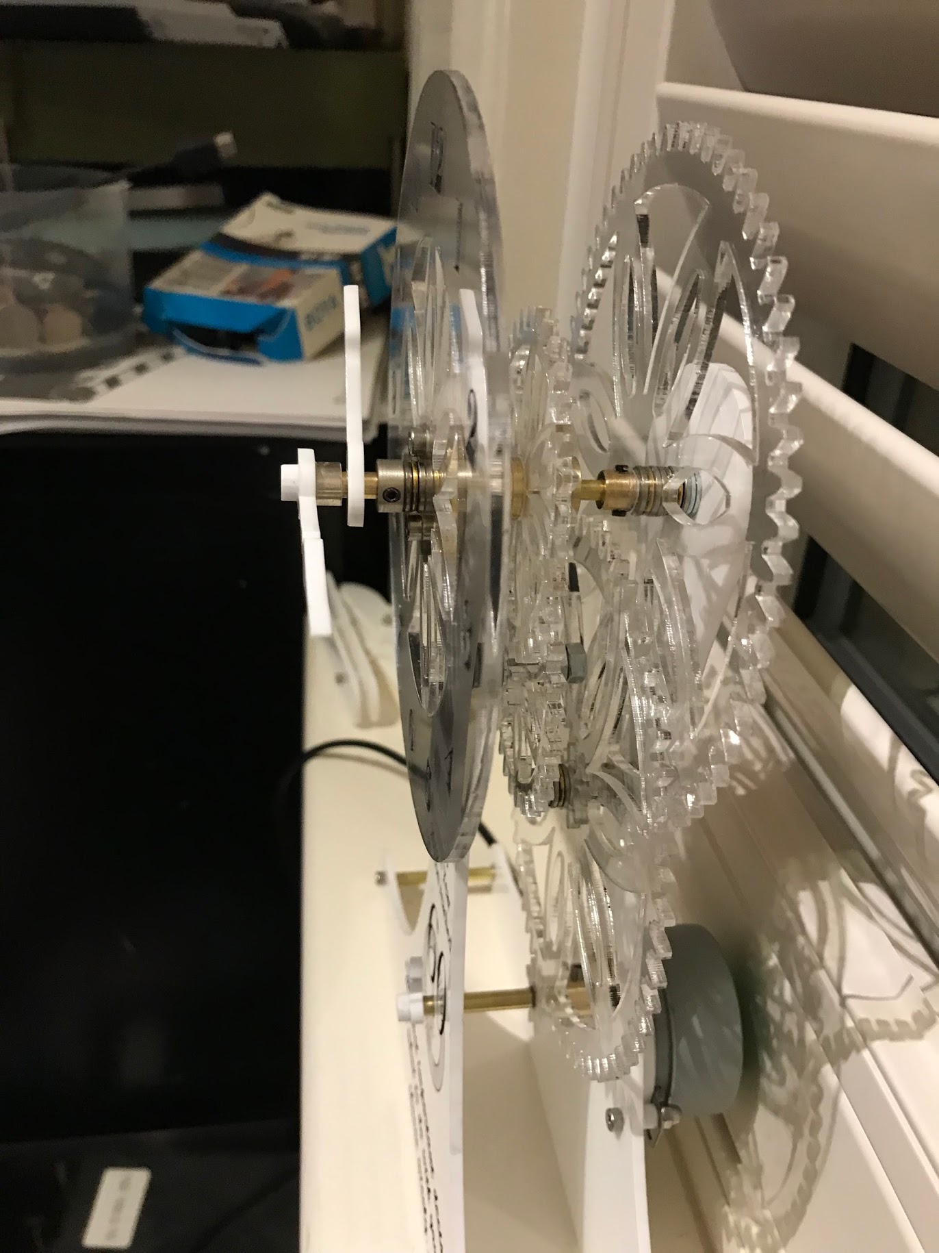 Hi I have finished creating with gearotics a clock for my friend. Designed the ratios using a spreadsheed drew the frame with draftsight, cut the acrylic with my laser cutter. Keeps good time (< 1 minute in three weeks) and will be giving it to my friend in a week. Really enjoyed the project, all brass components were made on my lathe.