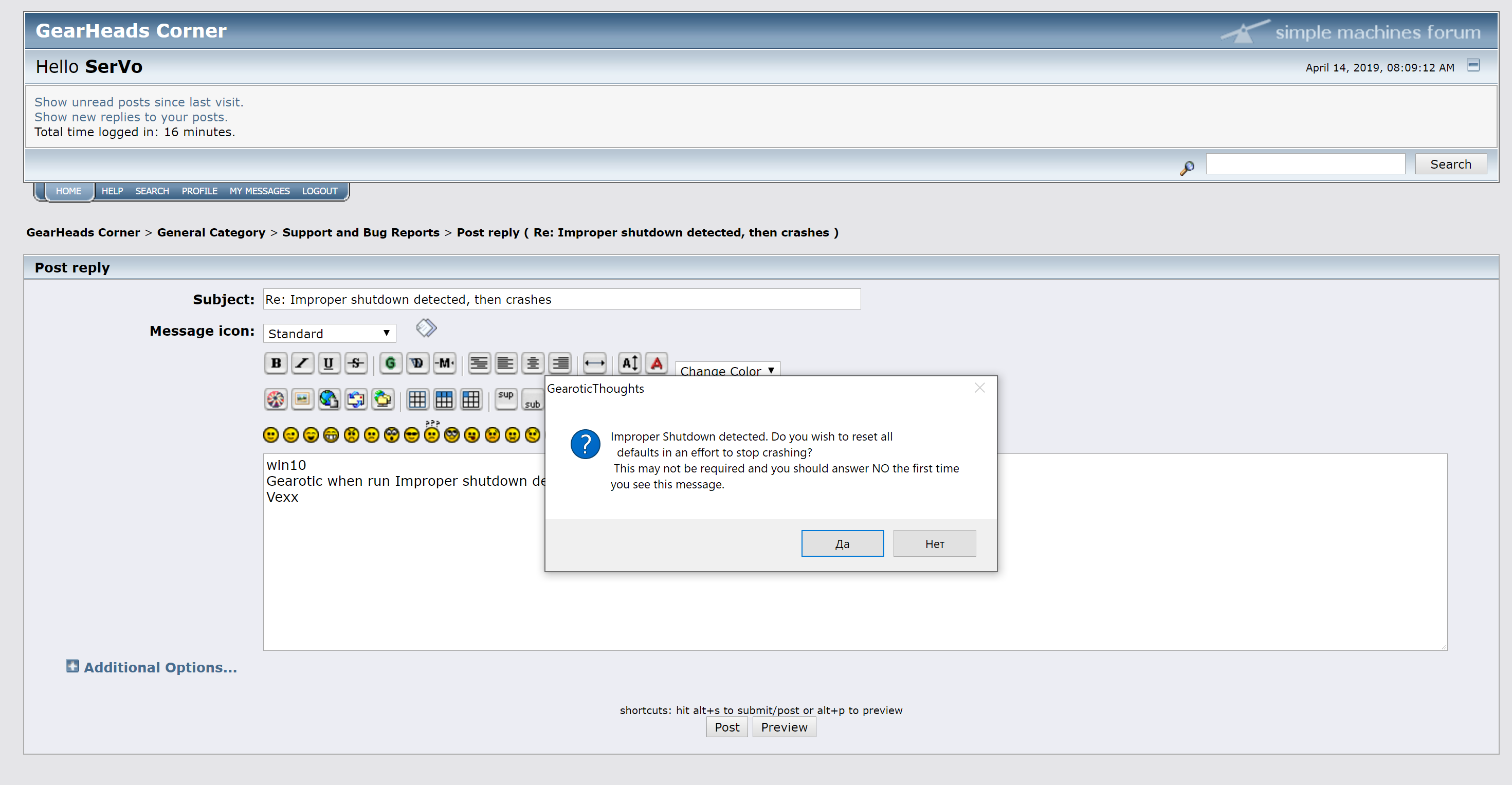 I decided to update to the latest release, but after an install I go to start gearotic and it says improper shut down detected.  I click No or Yes then it says it has stopped working.