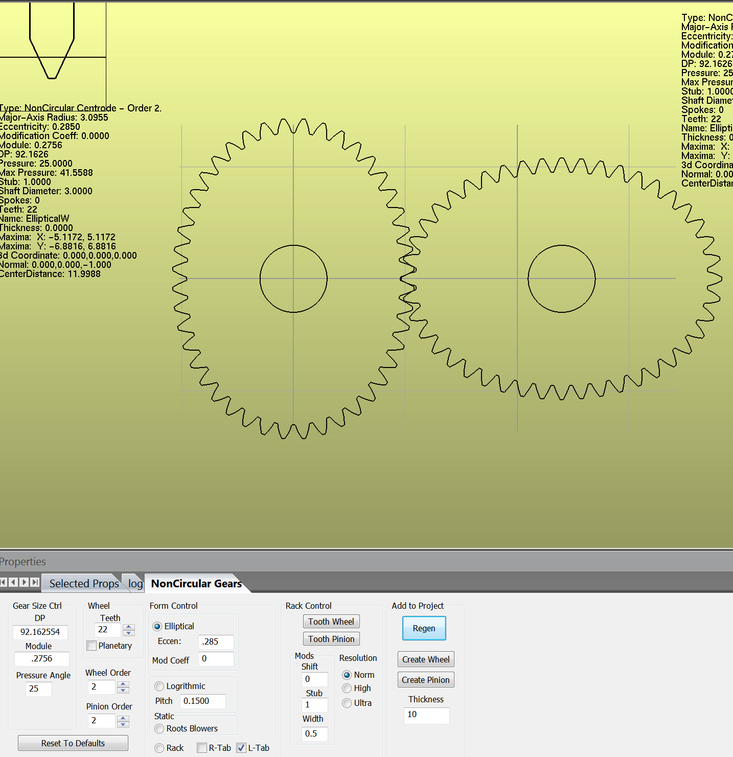 will make this a very accurate. The eccentricity is the reciprocal of the ratio of major/minor end radii. The gears I get doing this are 5mm/7mm with center distance of 12. Heres a photo