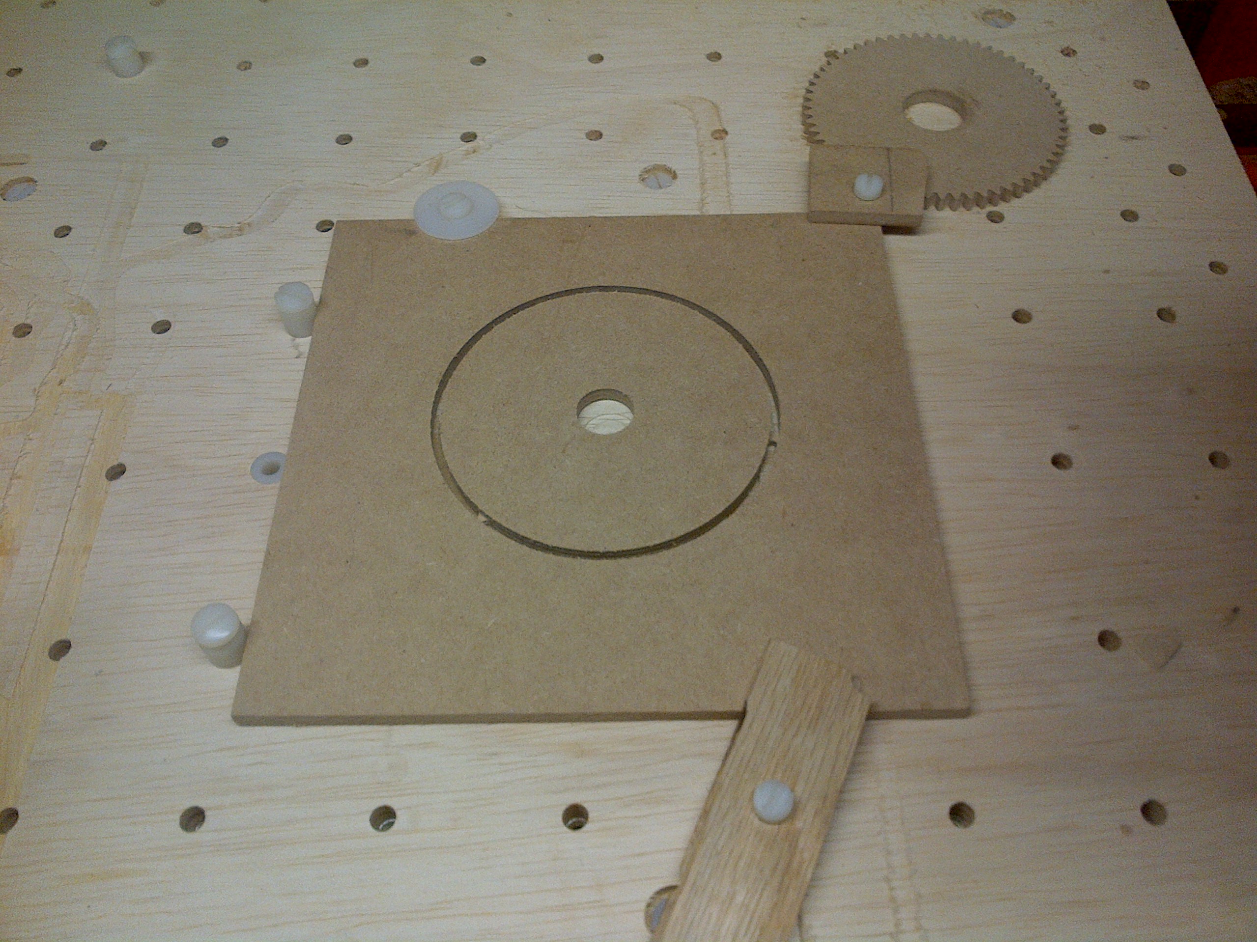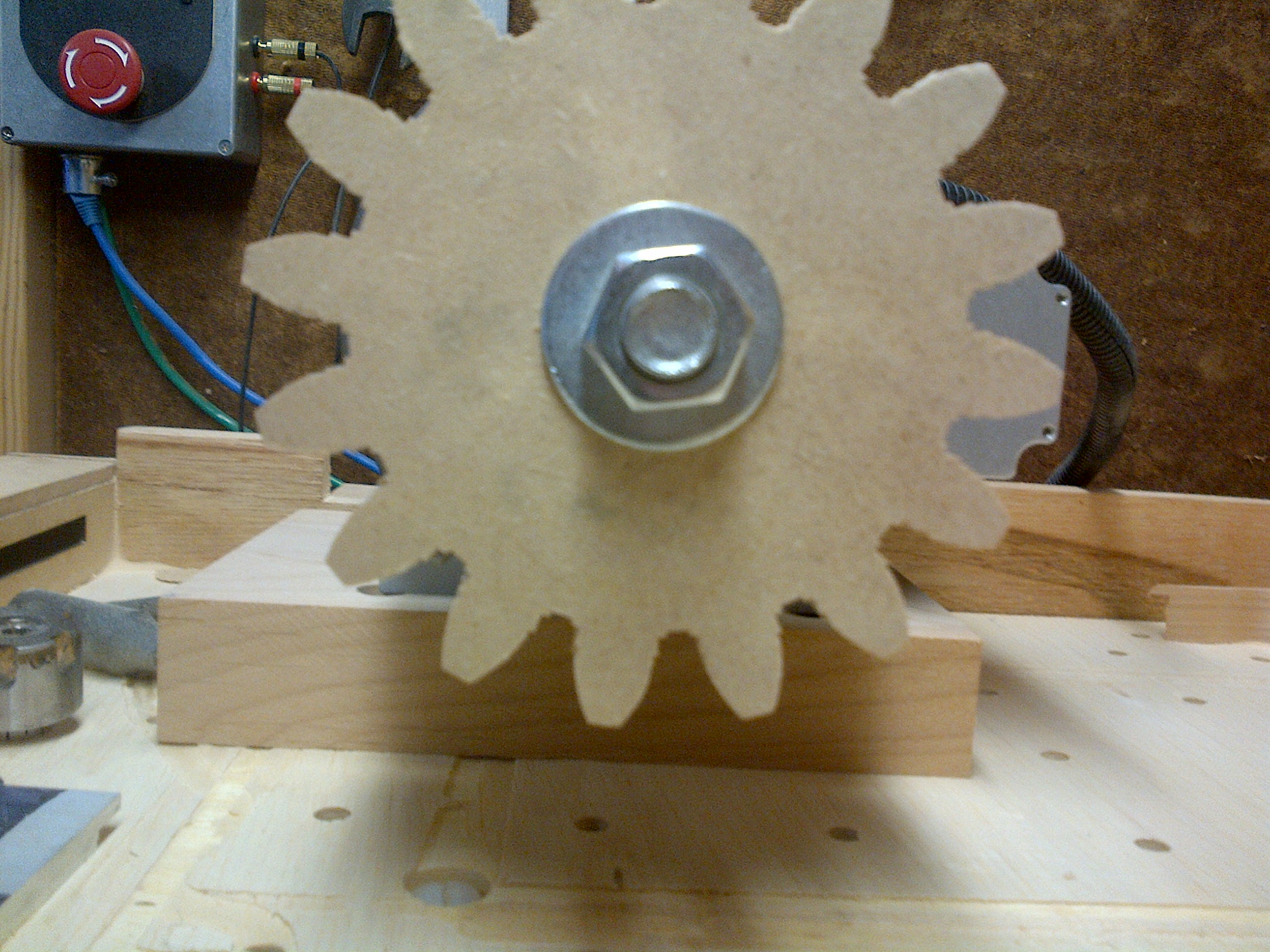 It was a lot of fun and I learned a lot having never done 4th axis before. The new drive arrived in less than a week from China, but then I needed to revamp my controller box since I didn't plan on expanding it beyond 3 axis when I built it. Even though I made the mounts out of hardwood, it still took a bit to map them out so I had room on my table to do both the creation of blanks and the gears. Learned about setting work coordinates so I could keep both options of blanks and gears open at the same time.