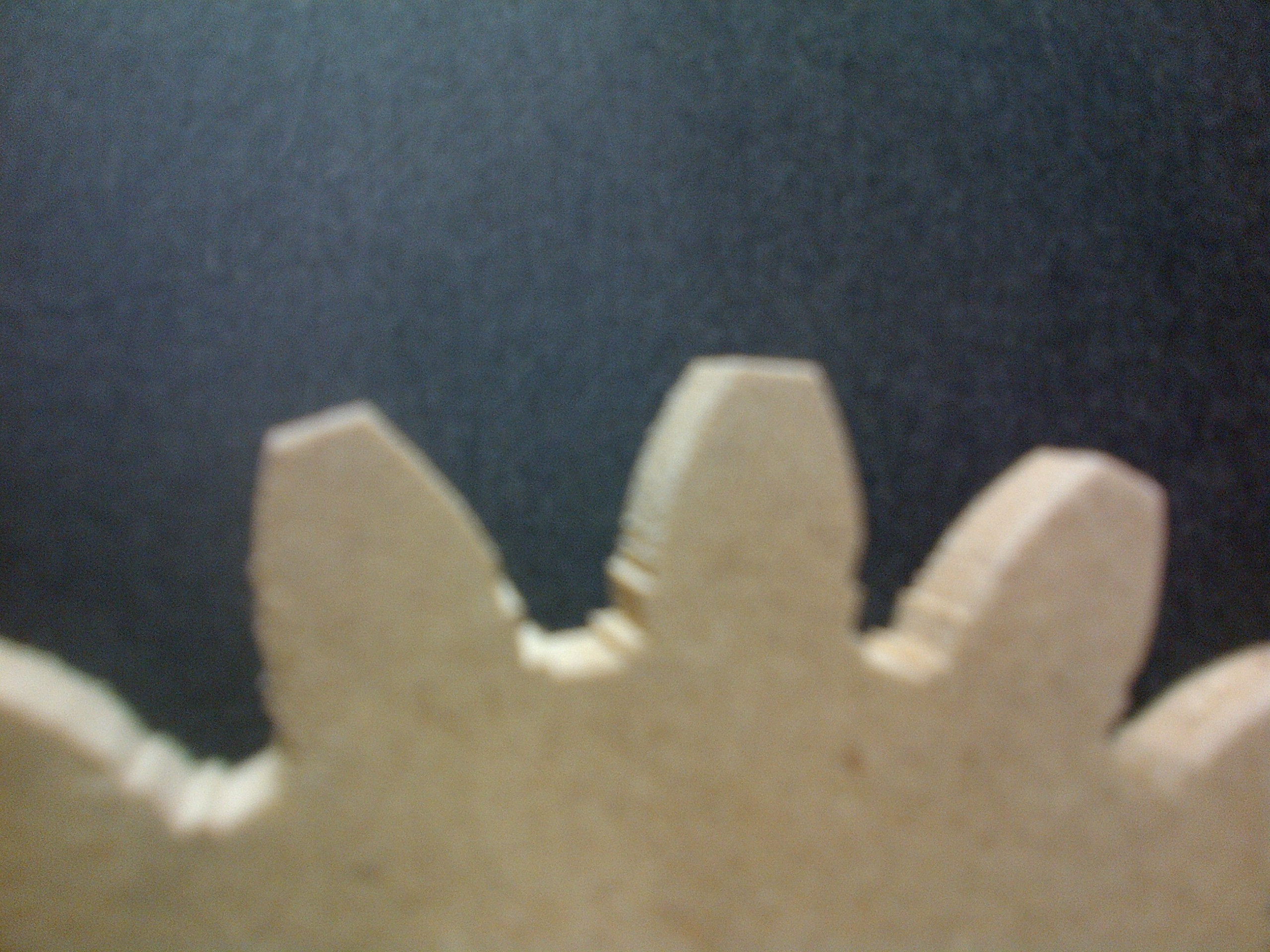 Here is the gear after the roughing pass. The top looks uneven, but that's due to the background I think. The teeth at the bottom of the photo are more in focus.