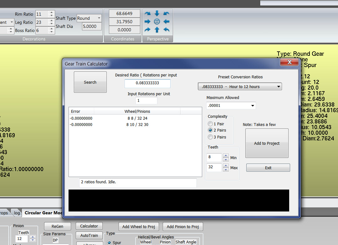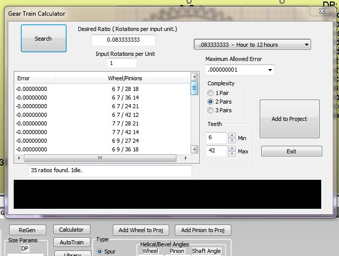 The more I get the chance to use Gearotic, the more interesting tools I'm finding. I've just discovered the AutoTrain function and decided to try and use it to add the 12:1 reduction needed from the one hour center wheel, for the minute hand, to the twelve hour hand. I'm using Clayton Boyer's "A Practical Guide to Wooden Wheeled Clock Design" as my guide. In it he suggests using the most common 3 x 4 double gear train in a 30/10 and 32/8 configuration.