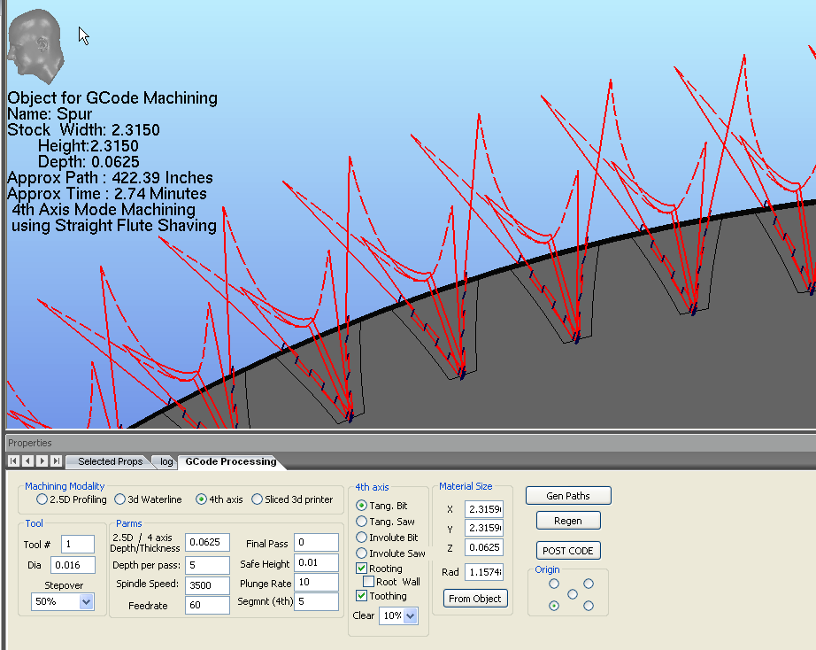 Well, those rooting passes look good. The depthperPass is used to set only the root passes, and is used if toothing is on or off. A saw has so much power you likely dont need it, but keep it in mind to flute work. The teeth are shaved in a number of "Segments" and thats what the segments box sets.. You might want to invert your direction bit for the A axis to see if shaving then works...its odd to me its that far out..