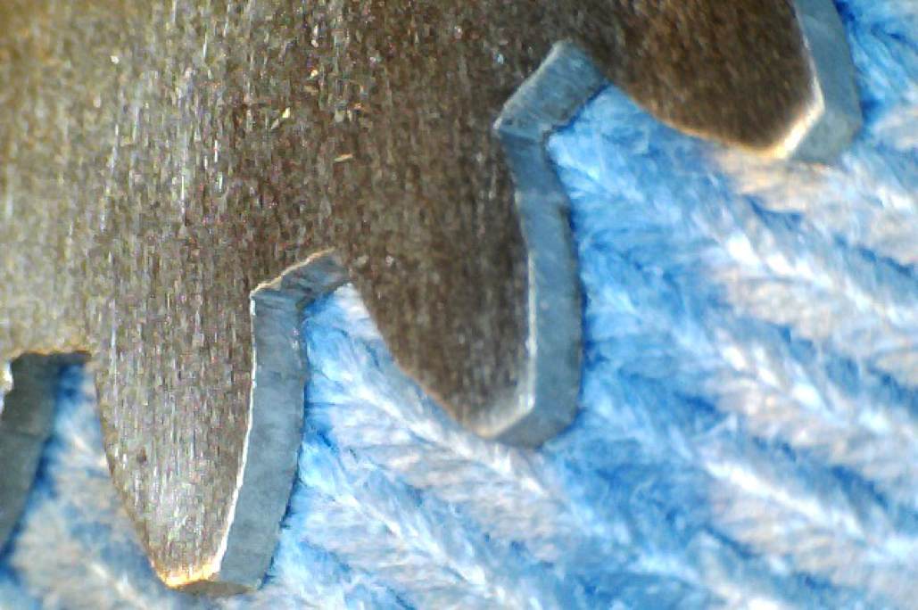 Considering the blanks are large washers from the local hardware store, the saw at least half past its best, the mandrel scrap brass sticking too far out of the chuck and unsupported (the last two to aid vision and photography) the magnified tooth view is surprisingly good.