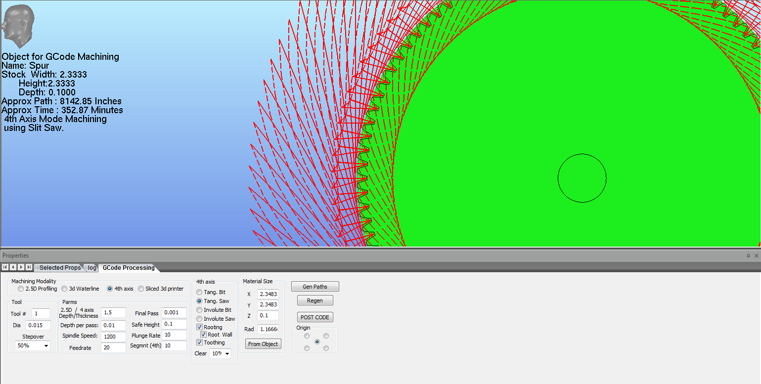 First screen shot is the 96 tooth 0.6 module with 0.015" saw as requested. I regenerated the code and still got the A 90 degree and deep Y plunge.