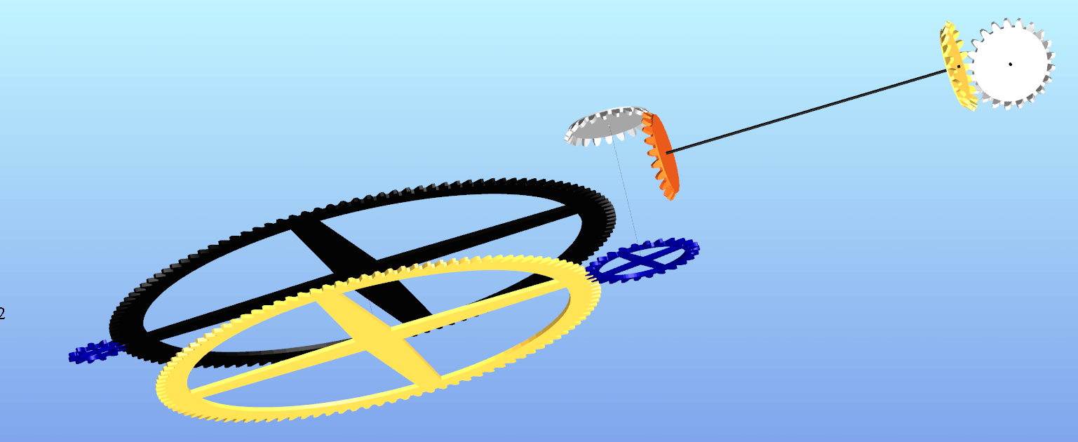 I've modeled the gear train (the tooth counts are not yet verified, but it's got what is involved so far). It's been more than a couple years since I played with Gearotic, but I am reminded how great this tool is, by virtue of being able to spend a few hours, watch a video of Art's and make the model!