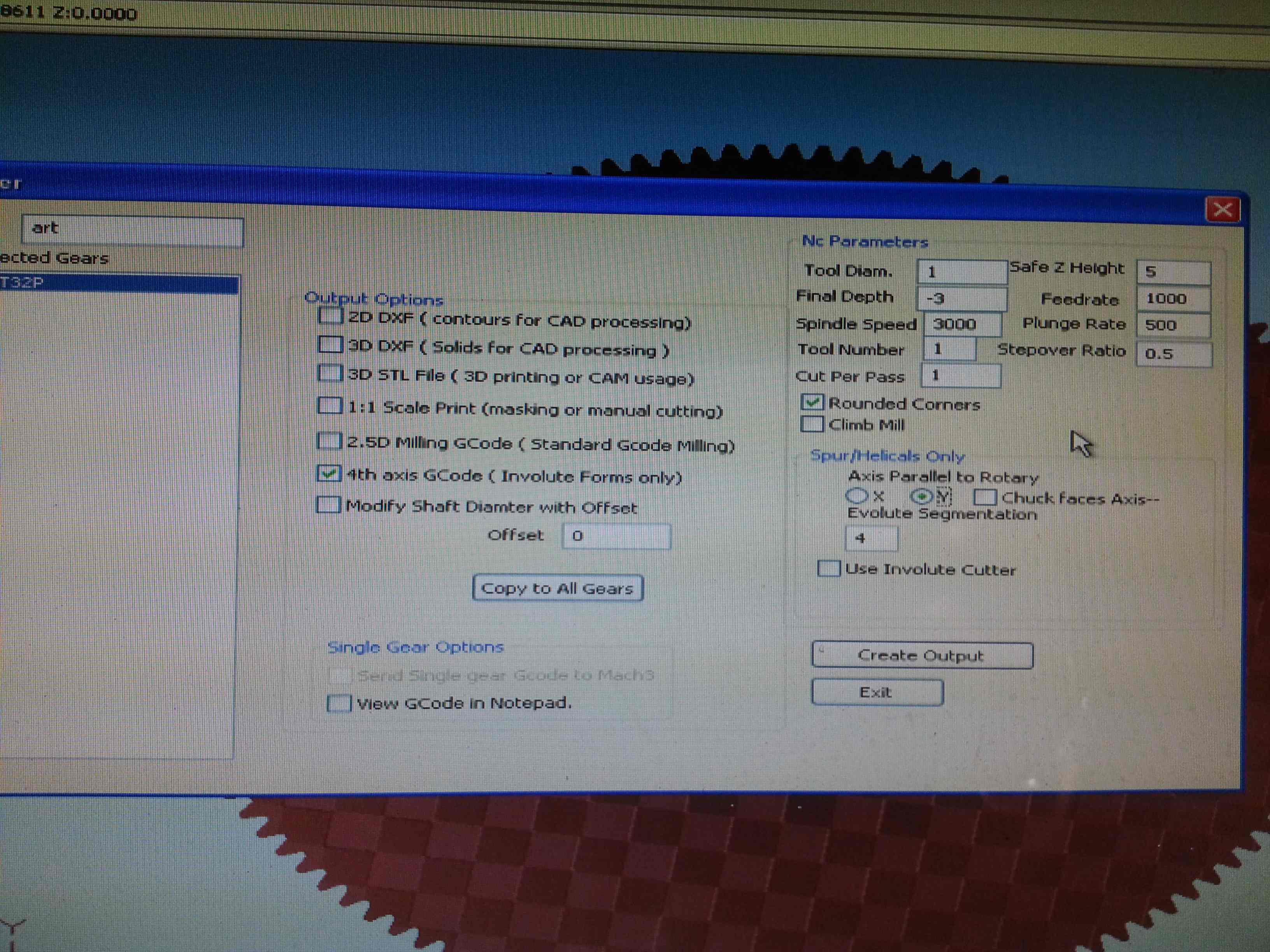 I'm really new at CNC and gears, so please be kind! I used Gearotic to generate a wheel, 32P, 124T, now translating that to metric, I get the module as 0.793 something, the wheel diameter works out to be just over 100mm, if I set the Use Involute Cutter in the Output Manager and tick 4th axis GCode with a 1mm end mill, I get a cut that makes sense to me, a round wheel with 124 straight cuts, I guess I would need a special cutter that is the same as the tooth profile? However, my understanding is that I can cut this profile with a normal end mill? If I do not choose the Use Involute Cutter in the Output Manger, the machine start cutting the gear, but then moves the Y and A axis and eventually ends up to the left of the A axis just cutting air.... My setup is as follow,