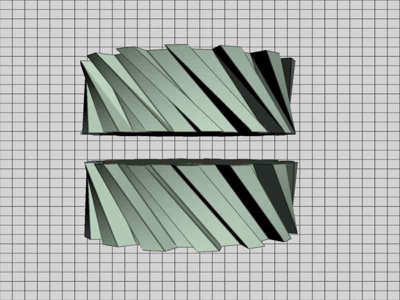 >>If you make a hundred really thin, identical spur gears and make two stacks of fifty, you can mesh them and arrange them to look like helical gears, or herringbo ne gears, or pretty much any weird thing you want. They will "work".
