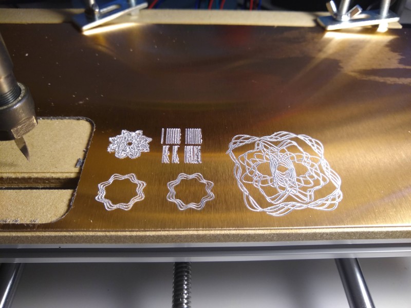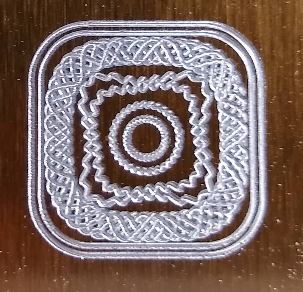 Your post was my inspiration to actually try making a guilloche pattern! It took a while because of some knee problems (you'd think that with two knees, 4 on a moose, that there's enough redundancy it wouldn't matter) it didn't happen until recently. My results aren't as good as yours, they're on a $200US machine with a 7000 rpm 100W spindle and those cheap flat sided V bits, plus there's operator issues. I need to find out what angle V bit works best, trying to avoid an Amazon shopping spree and just buy a bunch of them, and the inexpensive assortments are lower angle (10 to 40 iirc) bits. Might even try an inexpensive diamond drag bit once I get the technique down.