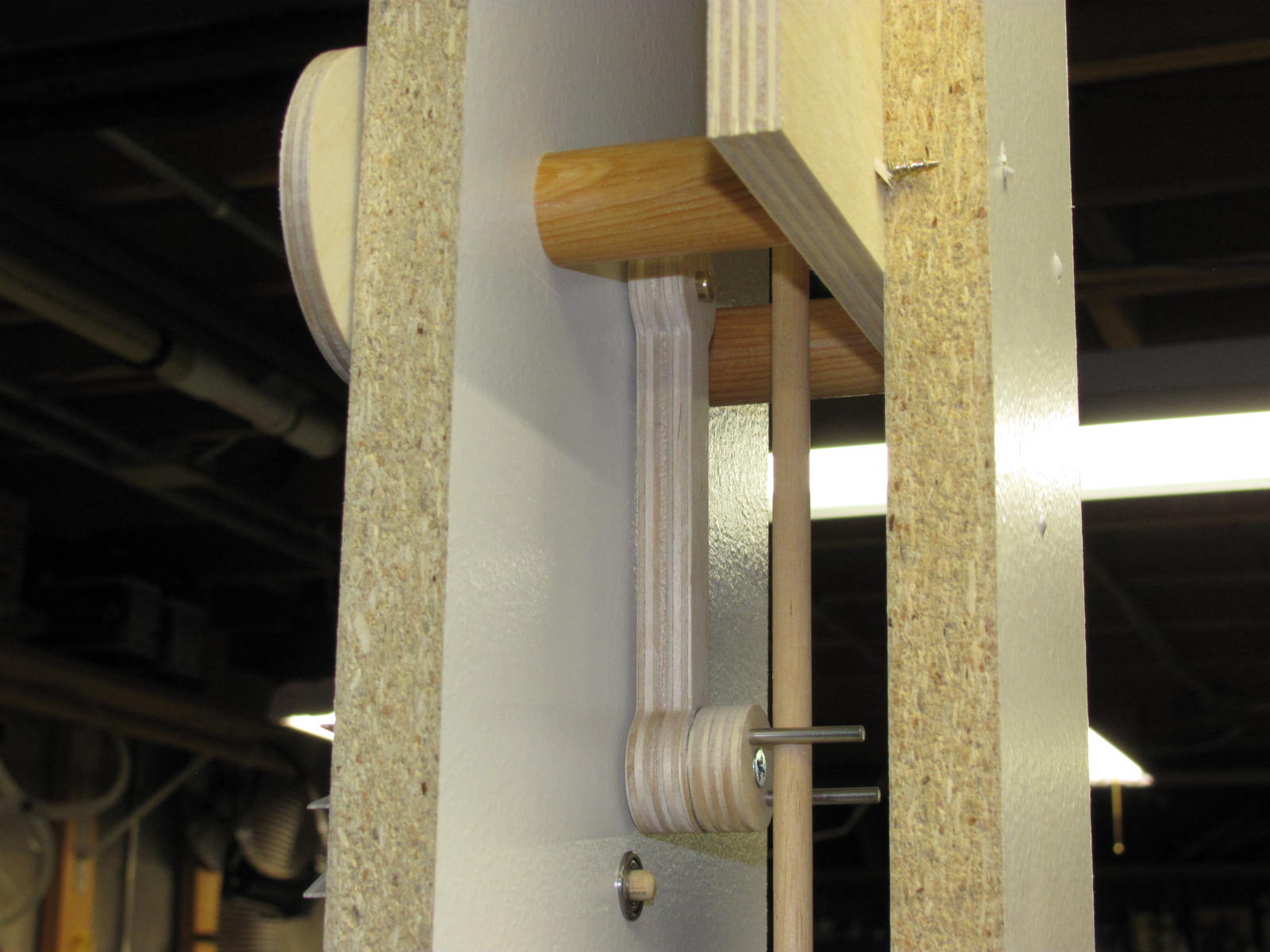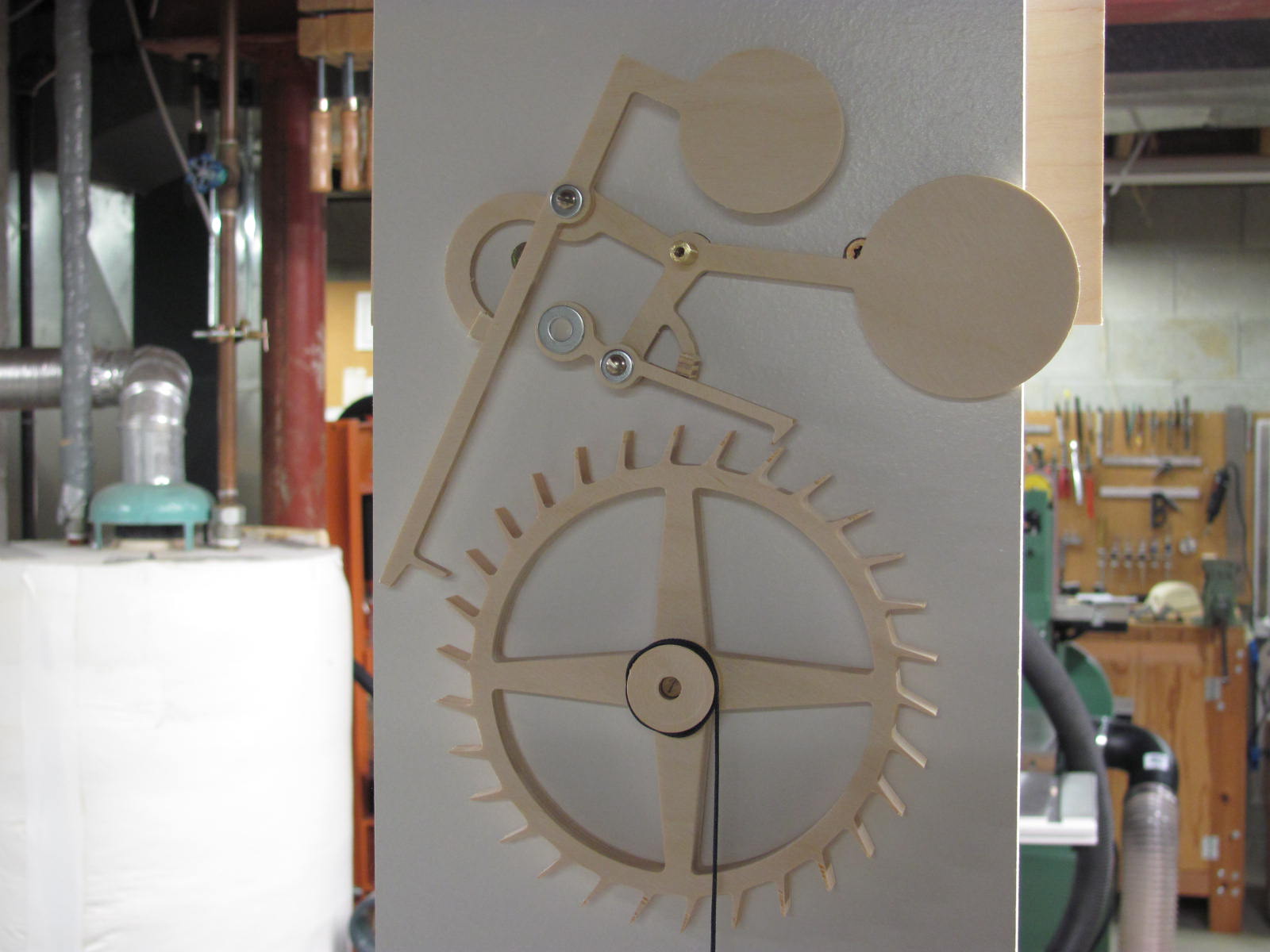 I finally got around to making the grasshopper escapement generated by the default settings in Gearotic just to see how it worked. The attached photos show the model on the testing board in my messy shop. I cut this using Baltic Birch which chipped due to the fine points in the mechanism but I sanded the points off with a disc sander jig and put it together anyway. Much to my delight, the thing ran great! Look for the video on the video section of this discussion board. I incorporated the adjustable crutch that I previously posted and it seems to work just fine. One MAJOR COMPLAINT that I have with Art's design is that I had to tape a little washer to the counter-weight part of the right pallet in order to get it to operate properly. With all that extra work, why bother with Gearotic? :D
