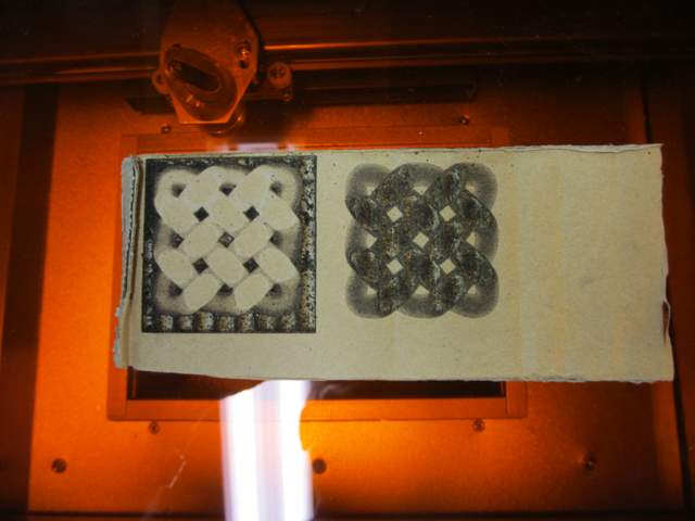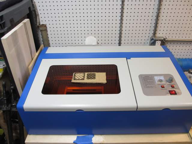 The laser has landed!  After unpacking, fixing a couple loose screws, a quick alignment test (almost, not quite, needed a bit of adjusting), and installing the included LaserDRW I fired it up and engraved a Celtic knot pattern on cardboard.  Not the best looking results, but it proved it's working!  No outside venting, the window I was planning to use was caulked shut so I need some driver vent hose to reach an unsealed one, so I didn't get very adventurous.  Still, it'll engrave or cut cardboard on very low power, and I did a little practice Plexiglas engraving with some of the kid's drawings.  I'll try Gearotic DXFs with the included sw next.