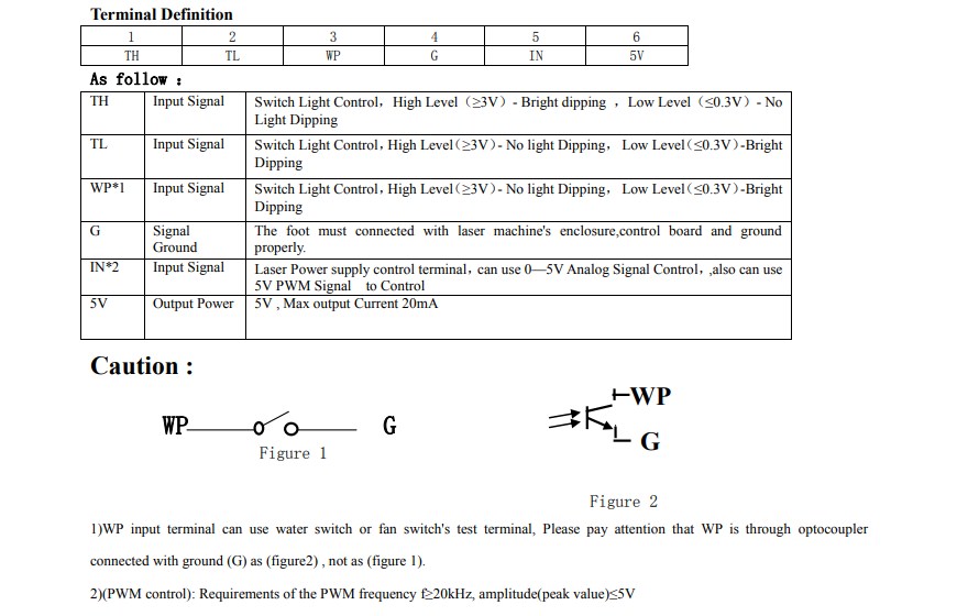 I manage to figure out to connect PWM at pin "20" but , like you know my stupid source have the residual voltage on analog input "0-5v" and between 10% and 20% power (set in auggie) the voltage is integrated on analog input source control only 160mv , and at 80W laser that is not quite right. I drop down the voltage on source input with a external 680R resistor but now i need to made the impedance adaptor , because a simple pc817 optocupler are not able to increase the PWM linear on that low impedance . I try with TLP705 but , i'm in france now with my job and without my osciloscope is hard to tell "blindly" what happen on laser input. I notice my source dont have TTL input , i attach below the photo of control. I didn't open the source , to see how is made the control circuit , but i didn't notice any delay of ON/Off . Whatever i will fix that in the feature .