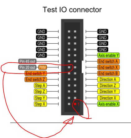 The following photo shows the Pokeys57 revision 2 changed the PWM location on the TestIO connector. As indicated by the arrow..