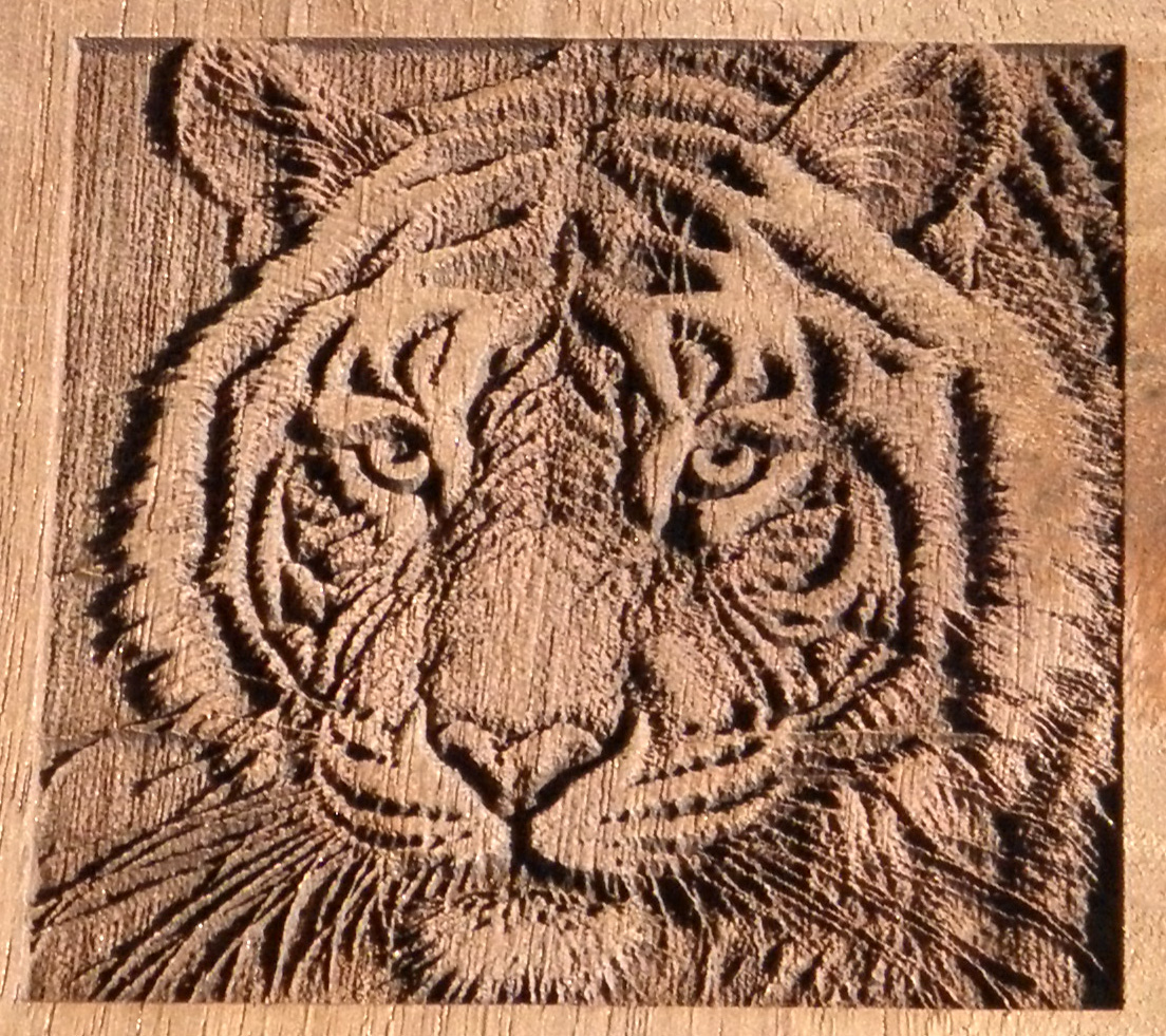 Took an image found on the net of a high res tiger, burnt walnut one pass 2" square, 0.060" deep