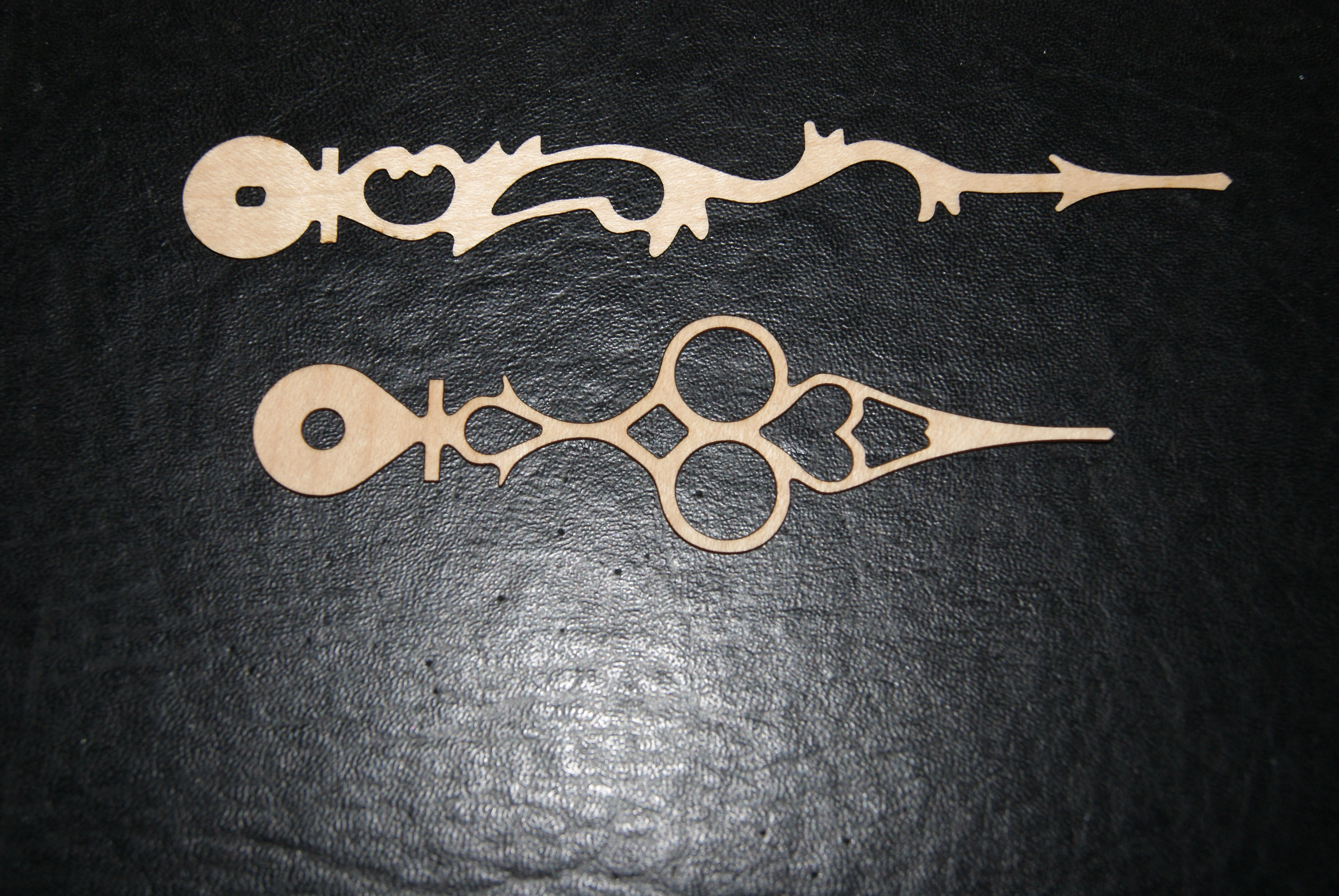 Today I decided that I wanted to make some clock hands. I was going to machine them but decided instead to laser cut them. I measured the clock mechanism and created a dxf file. I then modified the openings for the minute and hour hand shafts. I usually subtract .005 for the beam width. I laser cut the hand out of thin maple. They fit perfectly and I think they came out sweet. Now I just need a few parts to finish this project.