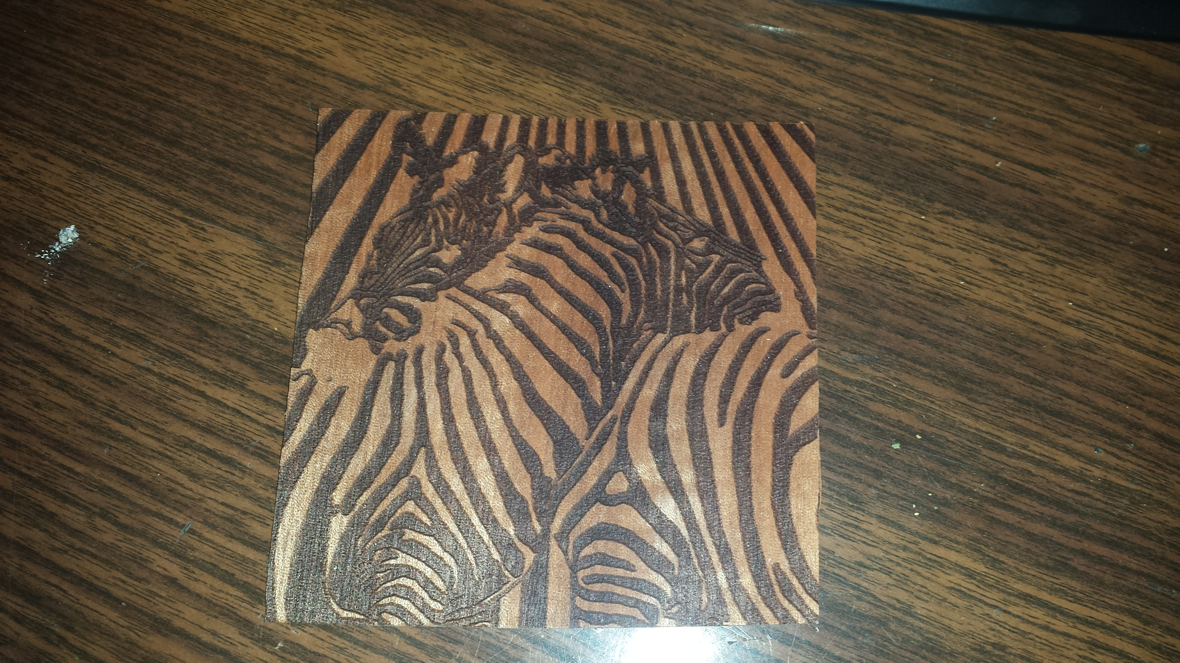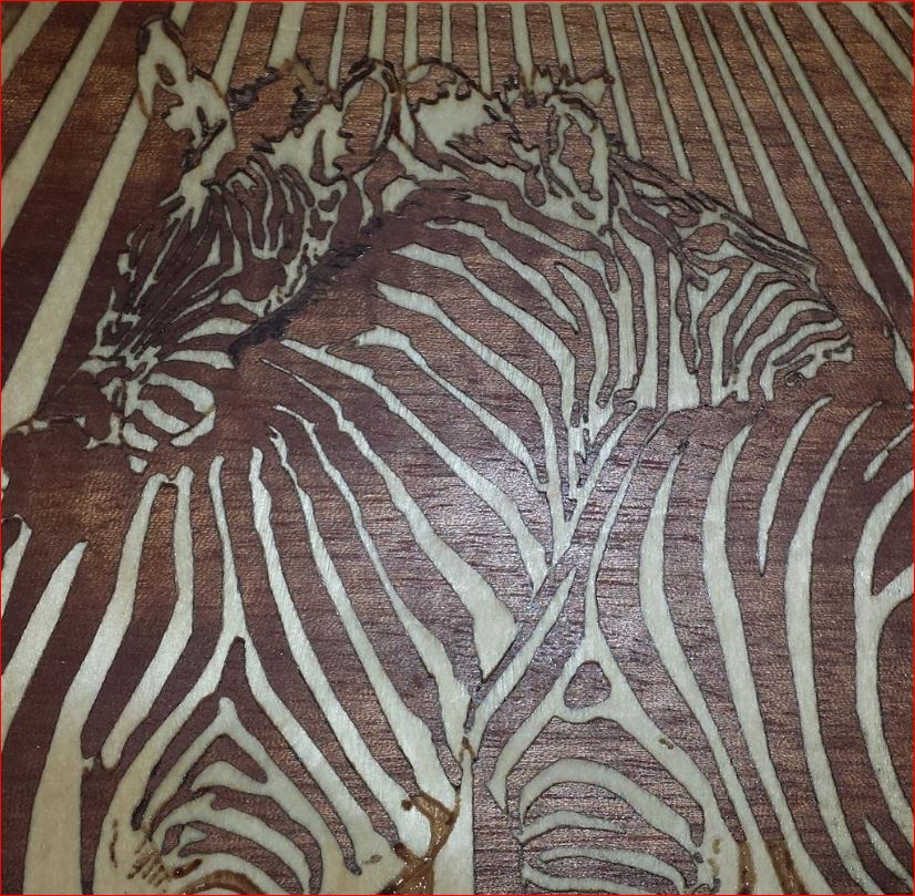 1) Engrave B&W photo of zebras into wood. 12 minutes.