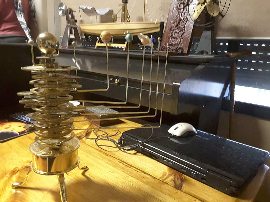 The second is The Capernican Planetary Orrery which rotates the known planets of his time. It involves "nested" brass tubes in order to achieve a central point of rotation.