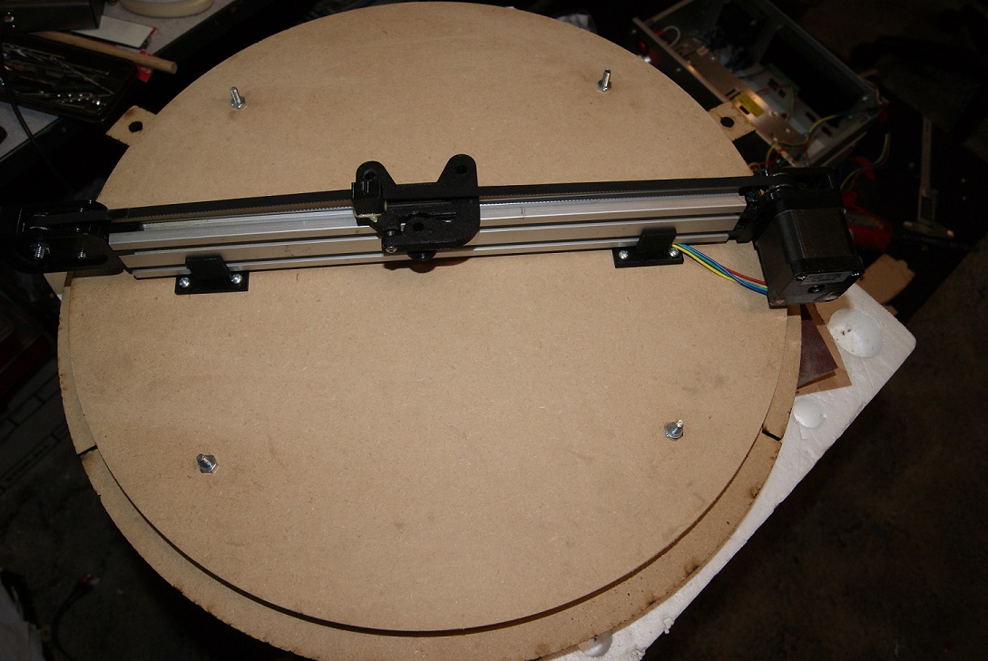 Here is the mechanism for the the Sisyphus type sand kinetic art piece. The base has a 120 tooth 16"D gear with a 18 tooth pinion. I used a large but quiet 16" lazy Susan bearing. The X axis uses a 3d printed motor mount, tension, end piece and carrier from Thingiverse. The motors are nema 17 and right now I'm running it on mach3 with my G540 drivers but will soon use an adruinio uno for the brain with a cnc shield.
