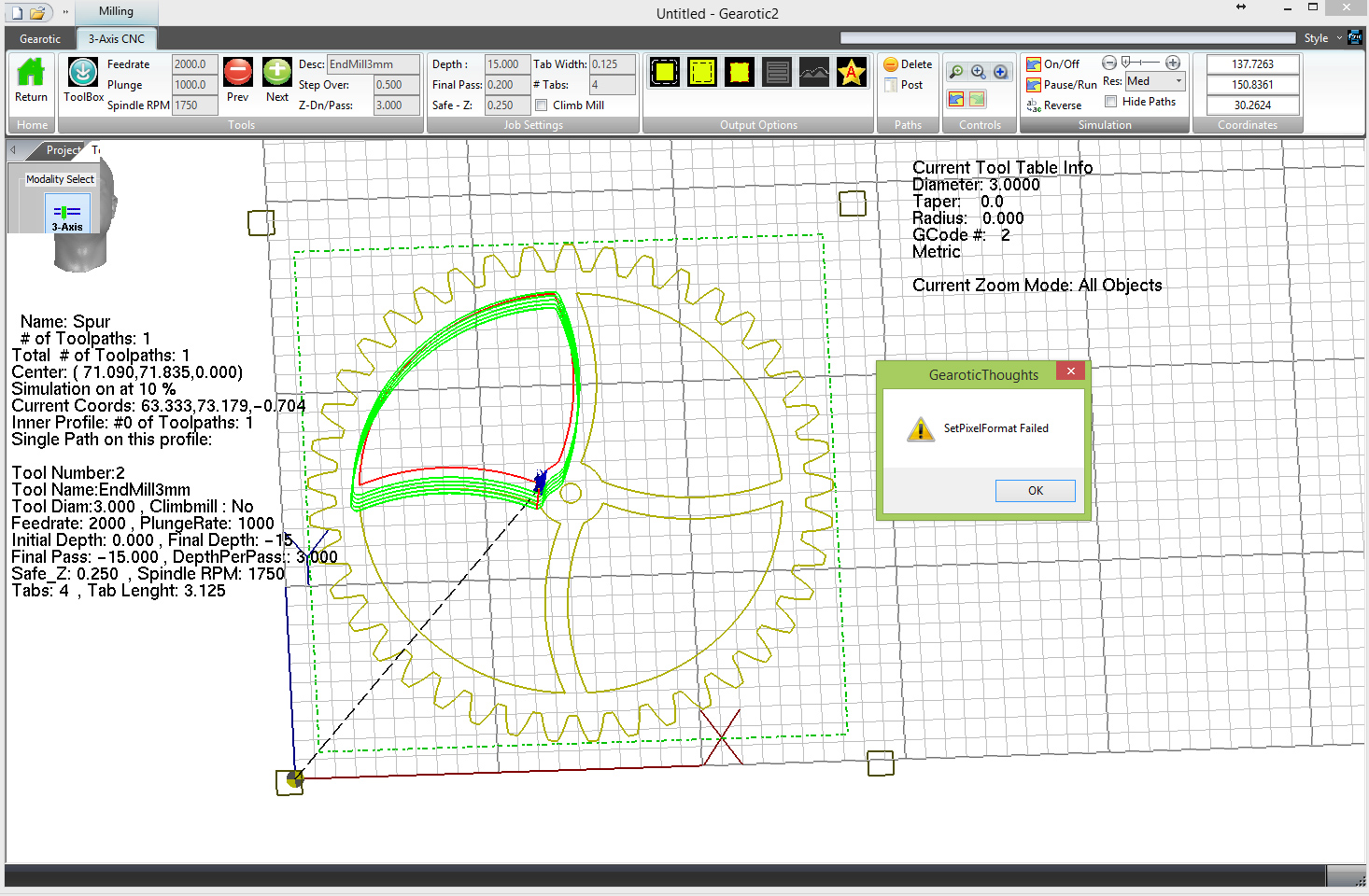 Whenever I try to do 3-axis CNC sim, I get "SetPixelFormat Failed" error. Am I doing something incorrectly?