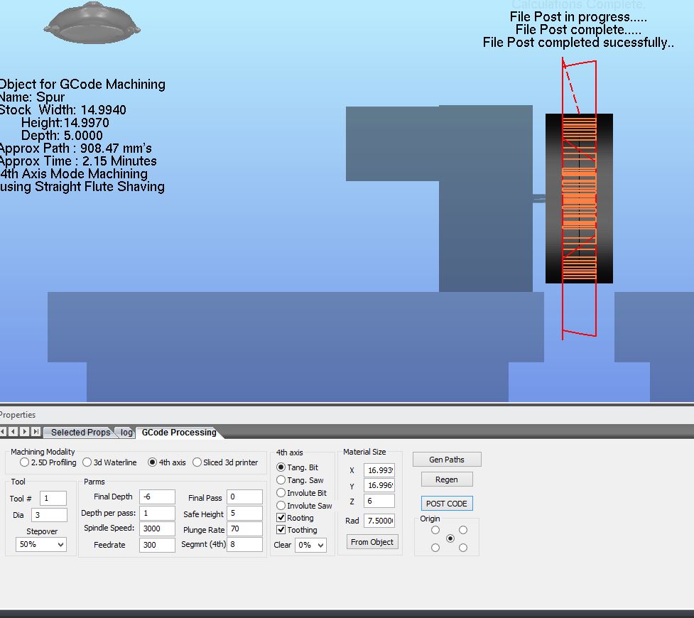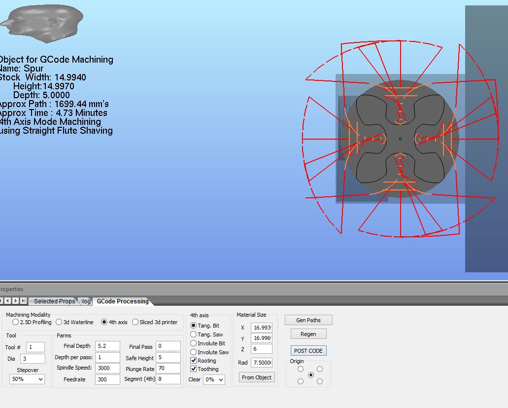 Of course, I had assumed that total depth related to the cut depth in 2.5D and had nothing to do with the 4th axis. It's difficult for the user to guess that you also use total depth in 4th axis to vary the gear thickness to avoid having to go back to the design stage. Seems to violate the whole principle of what you design is what you get. Total confusion for the user comes from throwing all parameters in one box then later using a parameter for another total unrelated, none intuitively function. Clearance seems to be another example. This is all very frustrating.