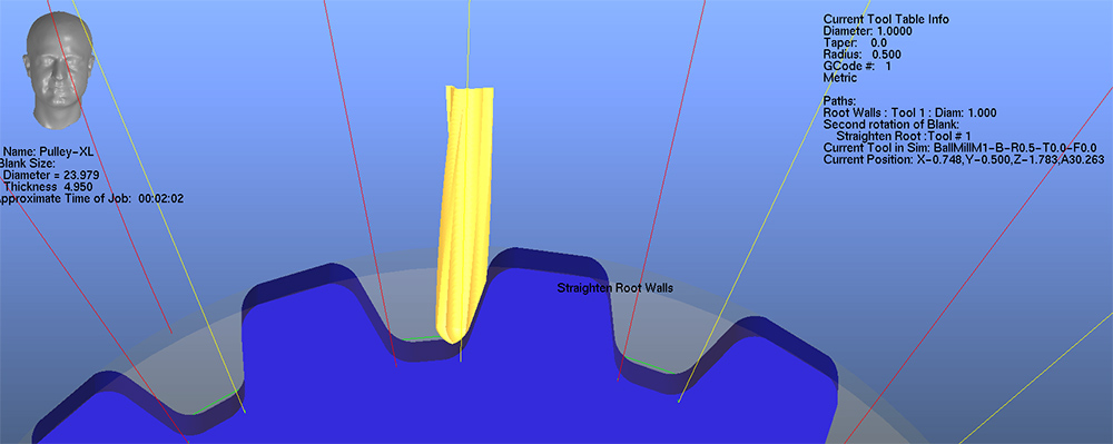 cutting gears on 4th axis, but few programs ( if any) actually cut pulleys or sprockets on 4th axis, so in G2, I allowed pulleys and sprockets to be done, and updated the algorithms so instead of using involute math to determine passes, it uses the actual graphical shape of the tooth.