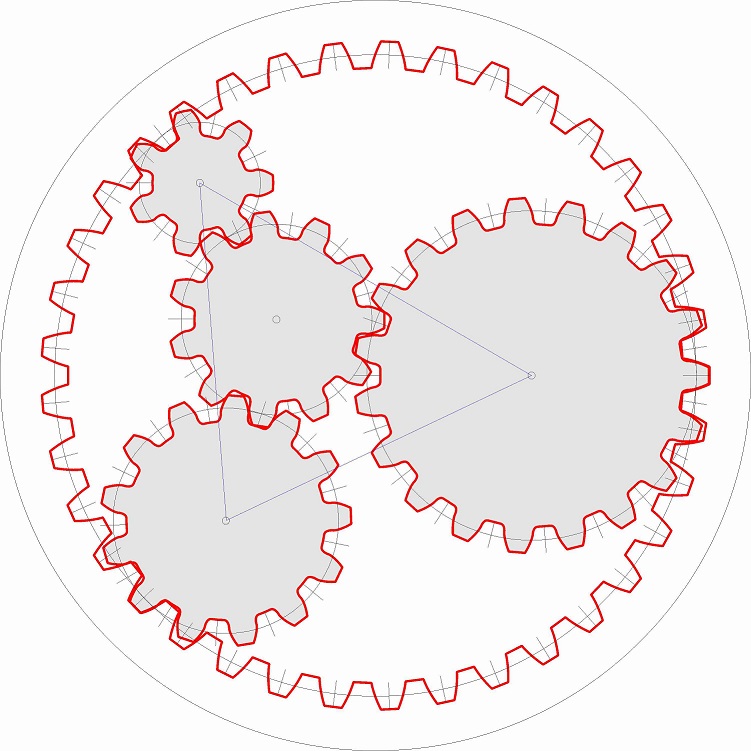 I would then have to run FindRing over the set of planet positions constrained by the size of the sun gear until I got a solution that has the correct radius for the ring gear. (I'm taking a leap of faith that I'd then have a configuration that would mesh and rotate, but at least I've seen it work for this set of gear sizes.) This is the kind of thing that gives "brute force" a bad name.