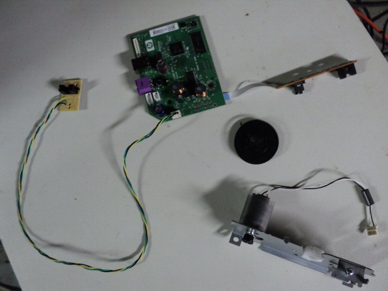 The last photo shows whats left. A circuit board, a paper drive motor and its encoder wheel, and two opto sensors.. one for paper in, and one for paper out. Once I put all this back together I'll see if I can write a driver that can print one line of output at a time on command. The theory being that this box will replace a spindle on a mill, and thus be able to print any picture to the width and length of a cnc driven gantry in single line prints at differing positions.