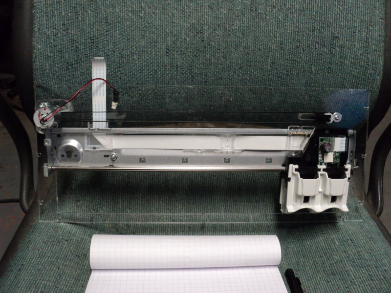 bottom of the box. The motor has been removed and moved to the back of the carriage. ( it used to be bolted in that round hole in the base plate upside down. ) This leaves the bottom flat with the inkjet the lowest point on the carriage.