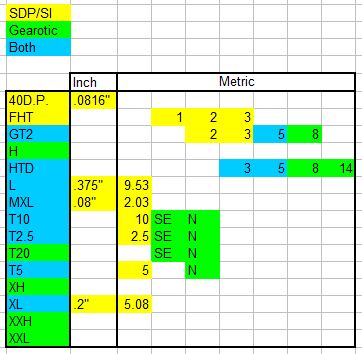 I have been using belt calculation feature to determine the combinations of components that would work for my application. I love the feature, Thank You. I also use the https://sdp-si.com/eStore/Catalog# website to purchase GT2-5mm pitch Timing Belts and Pulleys. Noticed that Gearotic has a 8mm pitch but no reference to the 2mm and 3mm pitch's SPD/SI supply, and they no reference to the 8mm you have.